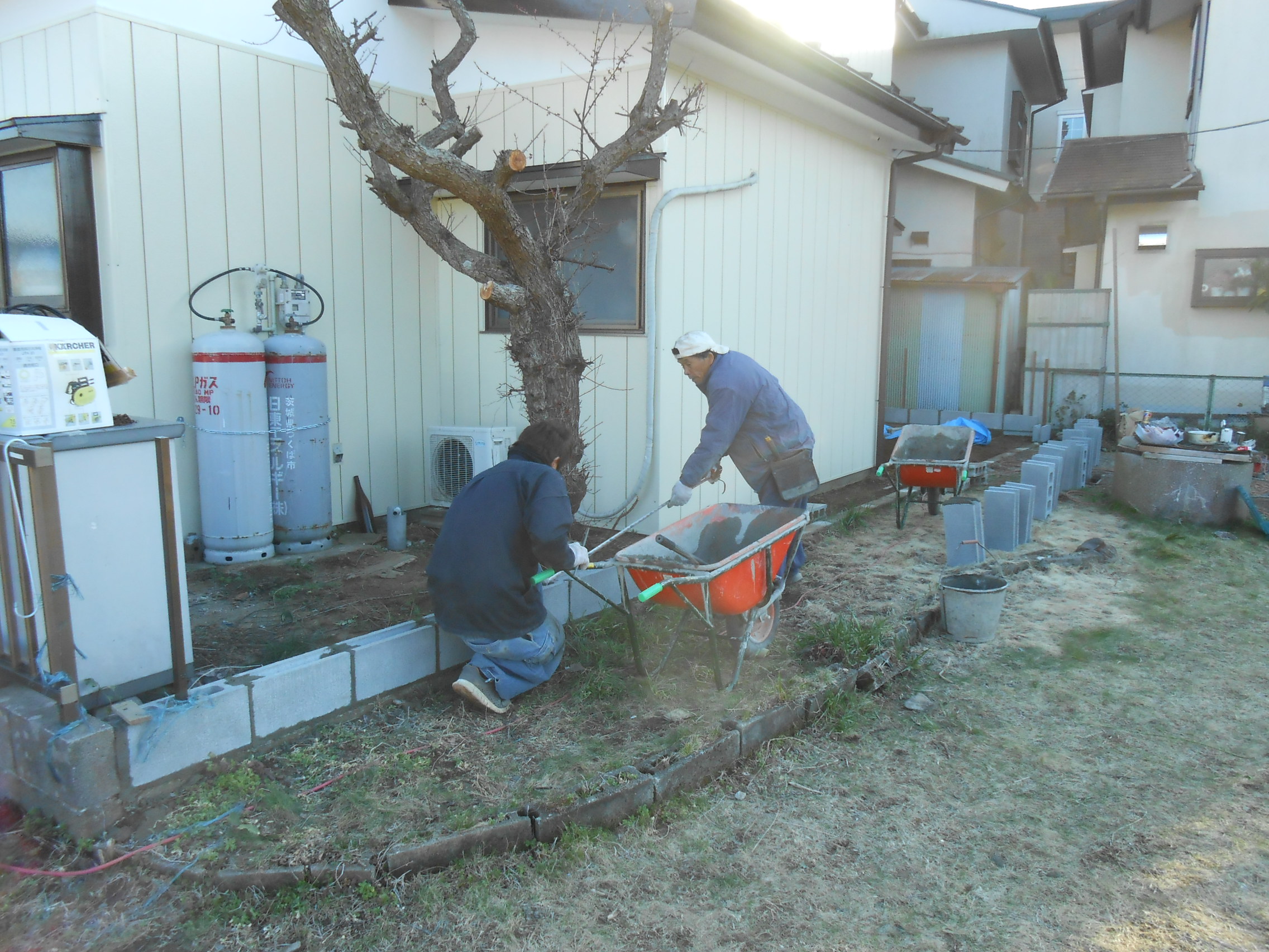 今回は、ブロックが一段しか積まれていなかったので、鉄筋で補強しながらブロックを一段積み、高さ80センチのアルミのフェンスを取付けました。