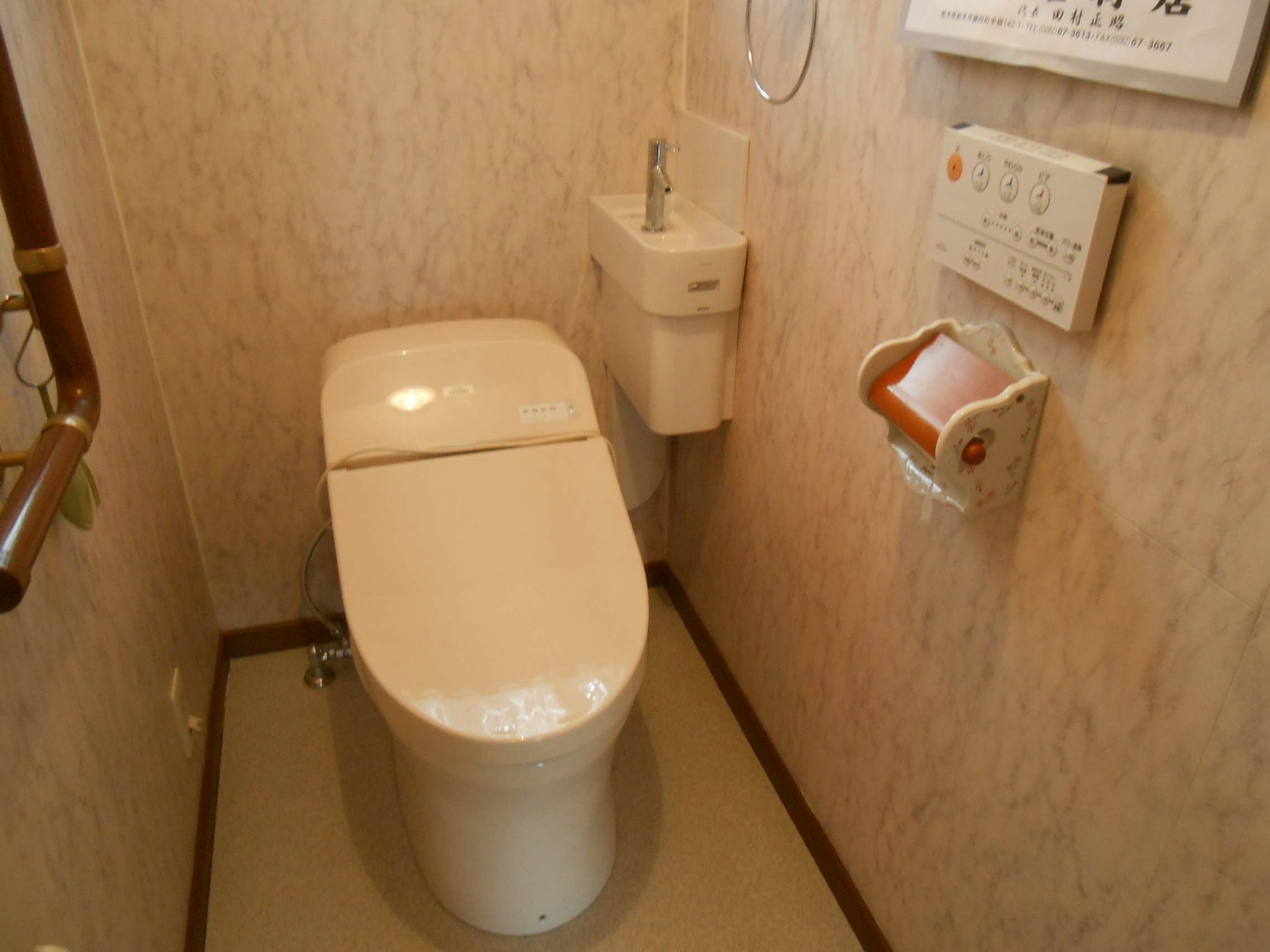 手洗器は便器横の隅に設置します。給排水はカバーで隠し、便器側に合流します。