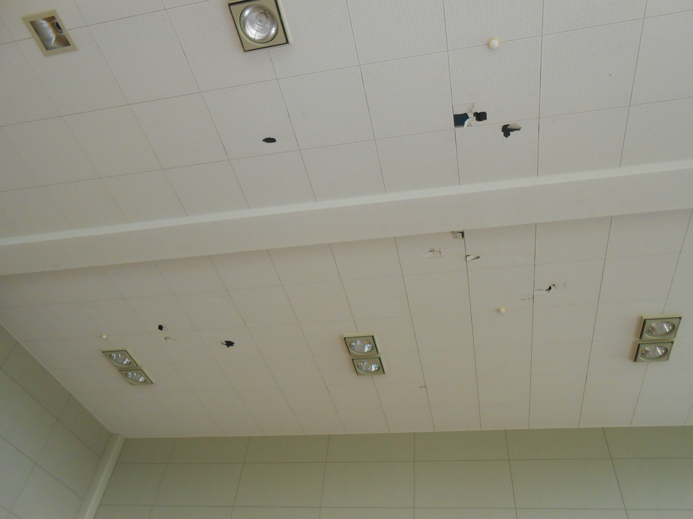 穴の開いている天井材を一枚ずつはがし、新しい天井材を貼りました。