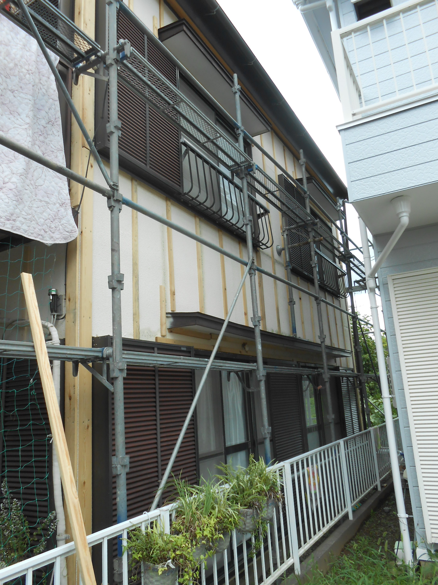 既存の外壁の上に、金属サイディングを貼るための下地となる木を留めていきます。