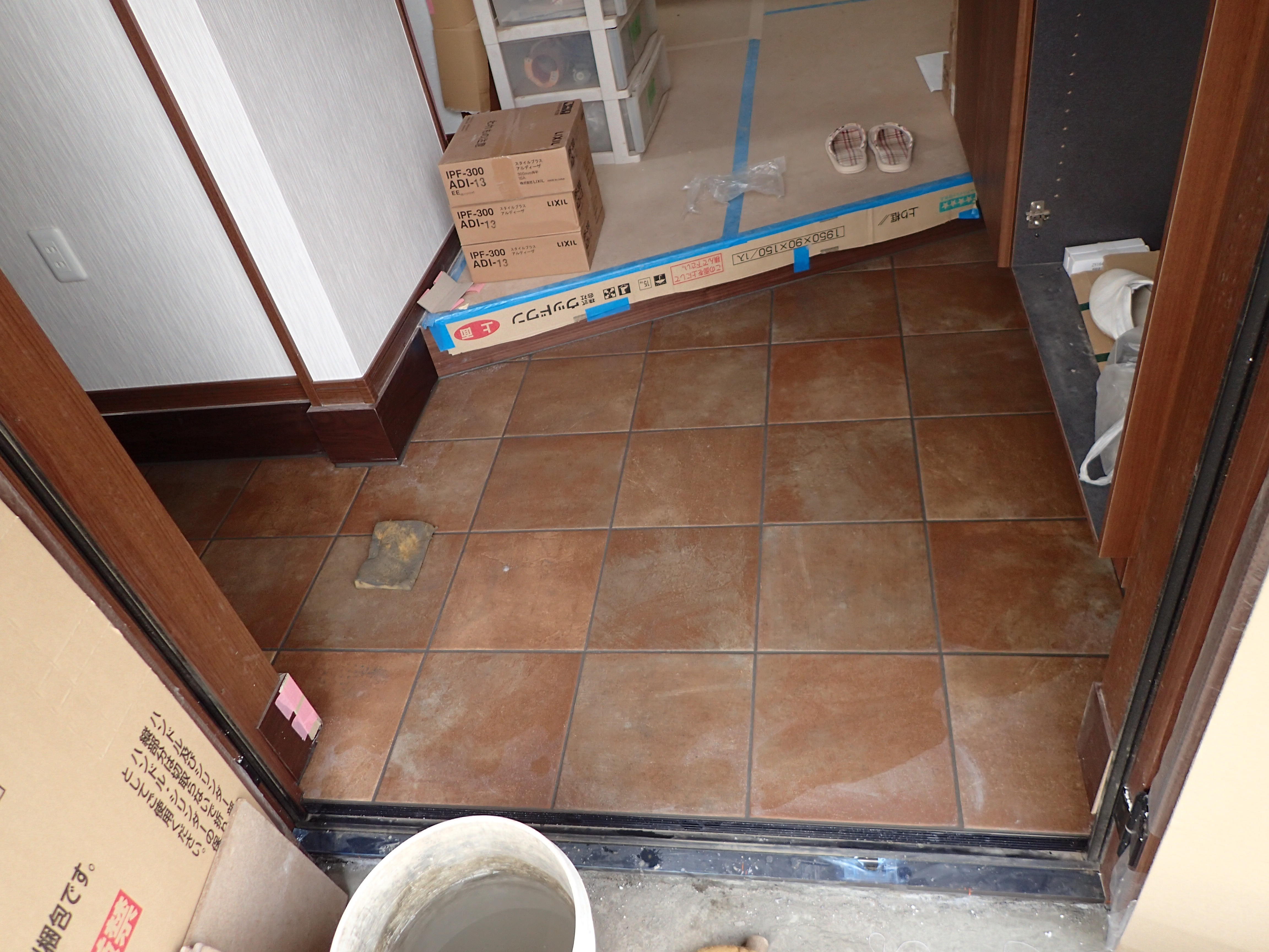 室内と外部のタイル目地が合うように寸法を計算して貼っていきます。