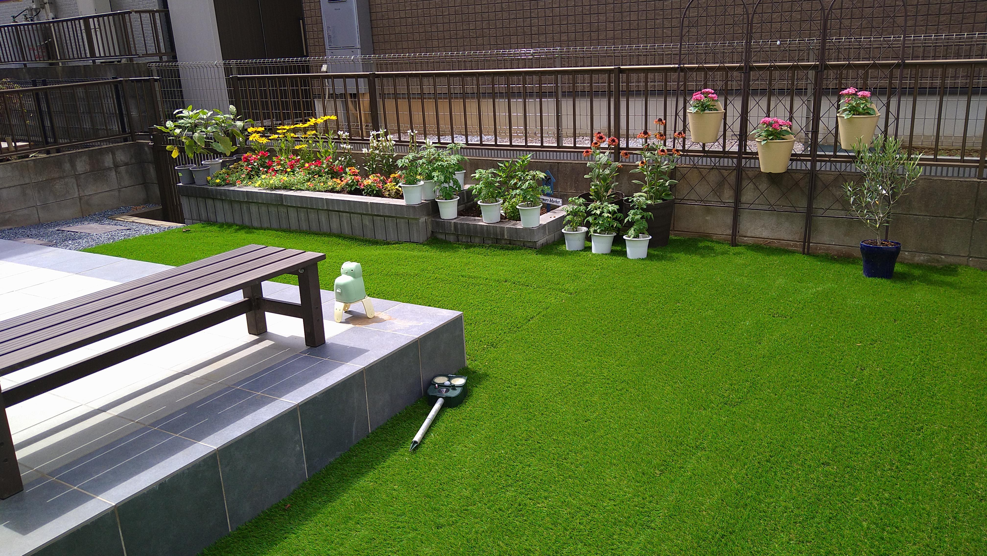 暗い印象が明るくなりますね。お庭を考える際には人工芝も一案に!