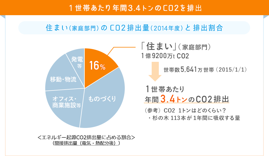 ちなみに、住宅から出るCO₂排出量は全体で16%という結果が出ているようです。大変な量です。