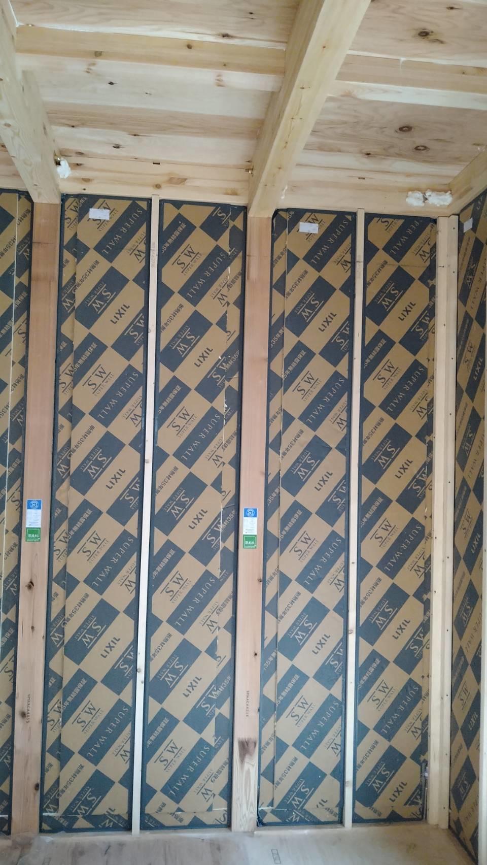柱や間柱、梁の寸法、窓の位置もプレカットの時点で打ち合わせをするため、すき間なくぴったりサイズのパネルが一枚一枚届き、それを大工さんが張ってビスで留めていきます。