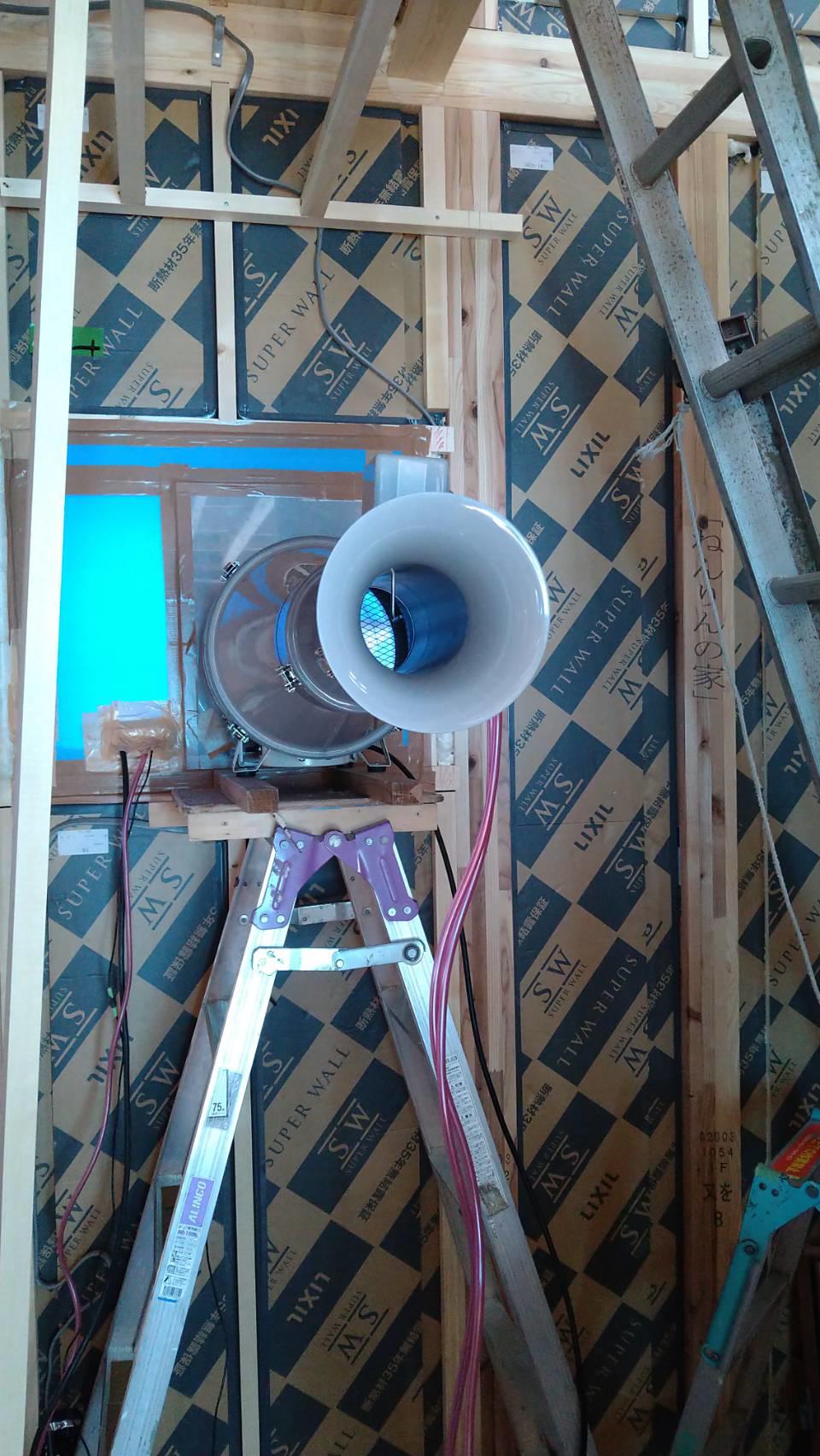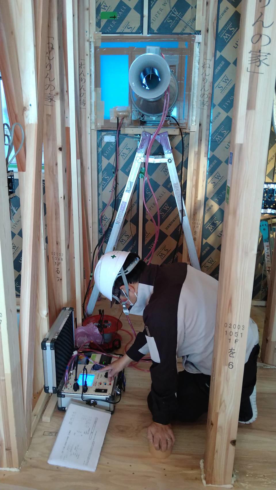 気密測定のタイミングは、内部の仕上げ材を貼る前の段階で行います。