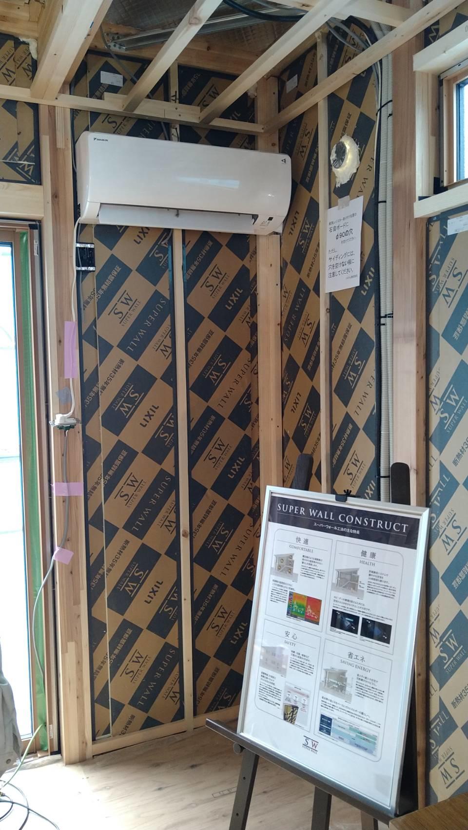 どういうことかといいますと、完成前ではありますが、ルームエアコン一台を設置し稼働しています。(エアコンの容量は12畳用3.6kWです)このエアコン一台でも家じゅうが暖かくなり、熱が逃げていきにくい住宅というのことを参加された方々に知っていただきたく開催しています。