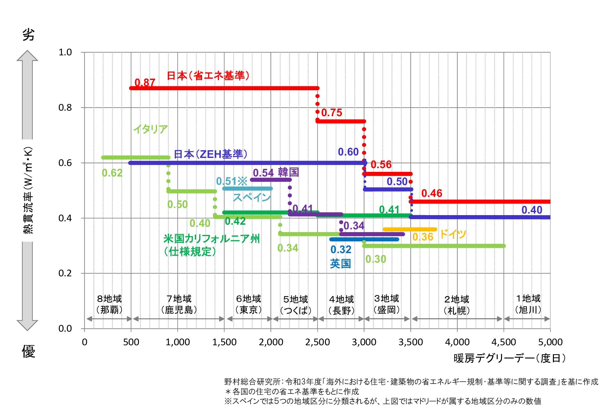 資料の表は分かりにくいですが、この資料からお伝えしたいことは、今日本で進めているZEH(ゼッチ)住宅というのは数値で言うと「0.6」です。欧米の基準は平均「0.35」程。