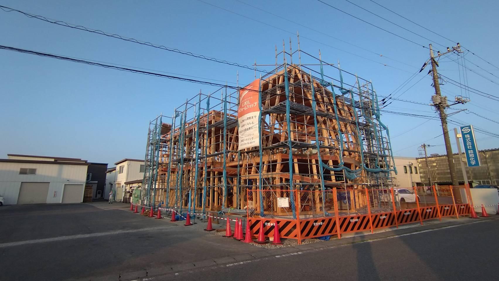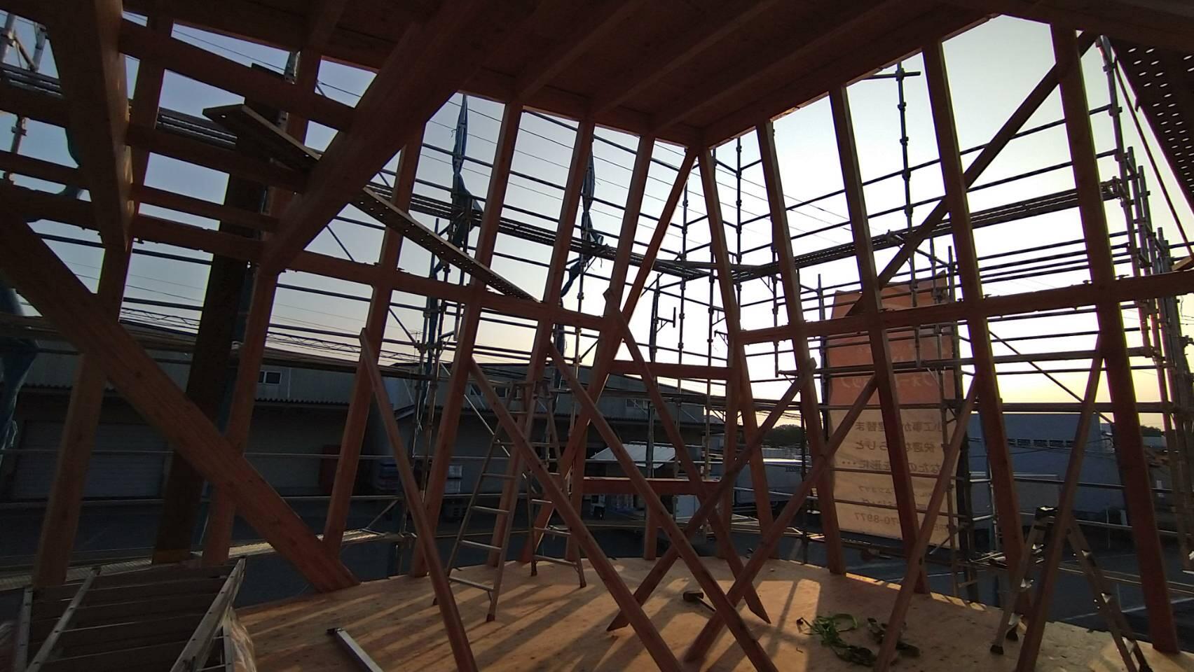 上棟すると骨組みが見えるので形がよくわかります。今回の建物は特に骨組みがきれいだと感じました。