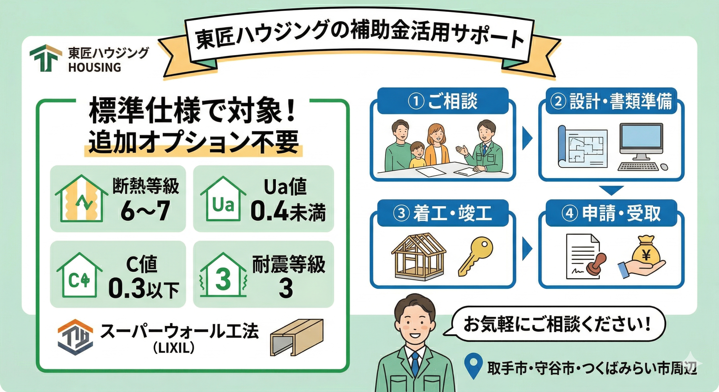 「補助金を使って家を建てたい」「自分は対象になる?」というご質問は、いつでもお気軽にお問い合わせください。取手市・守谷市・つくばみらい市周辺での家づくりを、東匠ハウジングがしっかりサポートします。