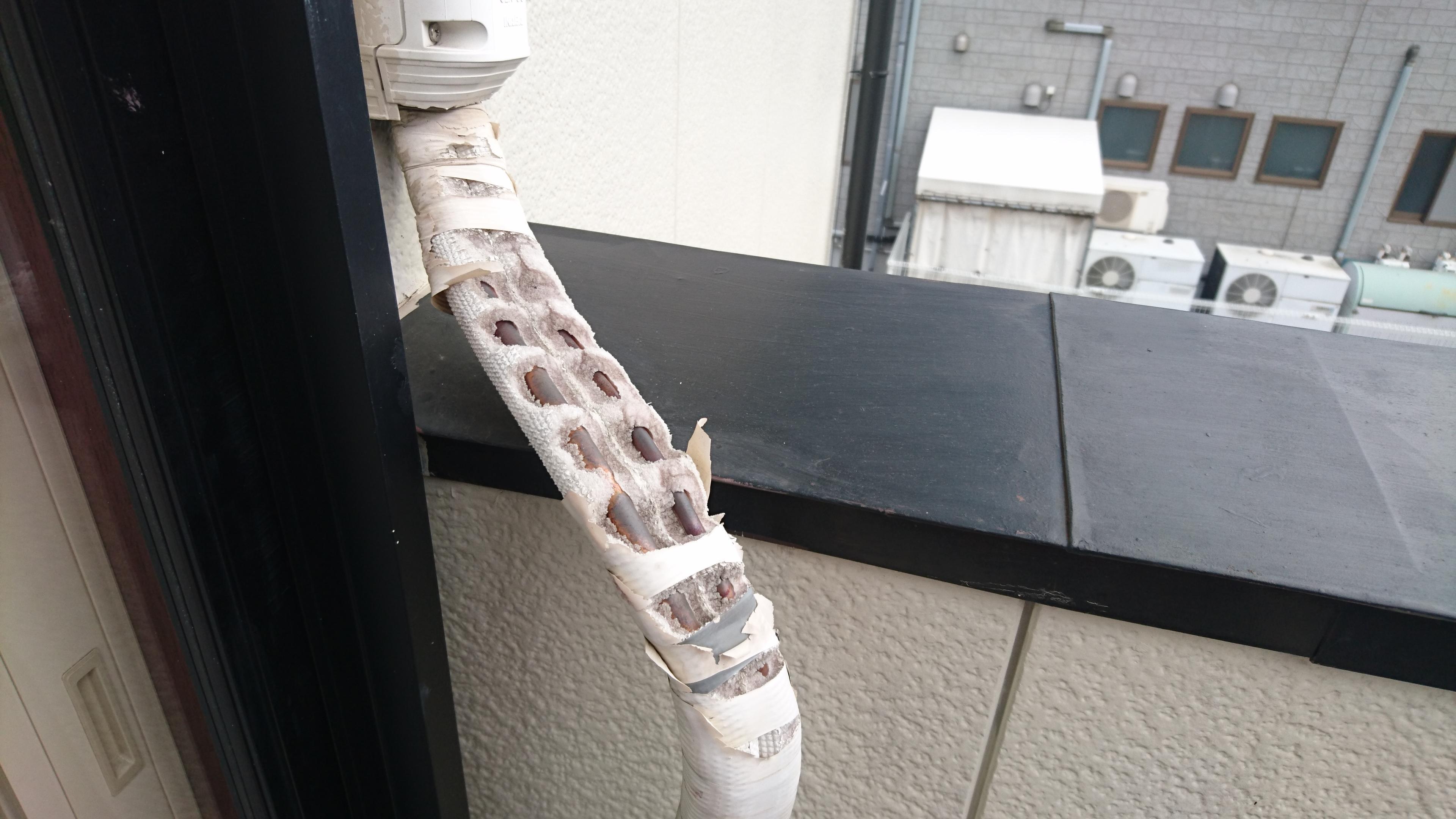 みなさまのお宅のエアコン配管はこんなことになってませんか?銅管が剥き出しになっていました。