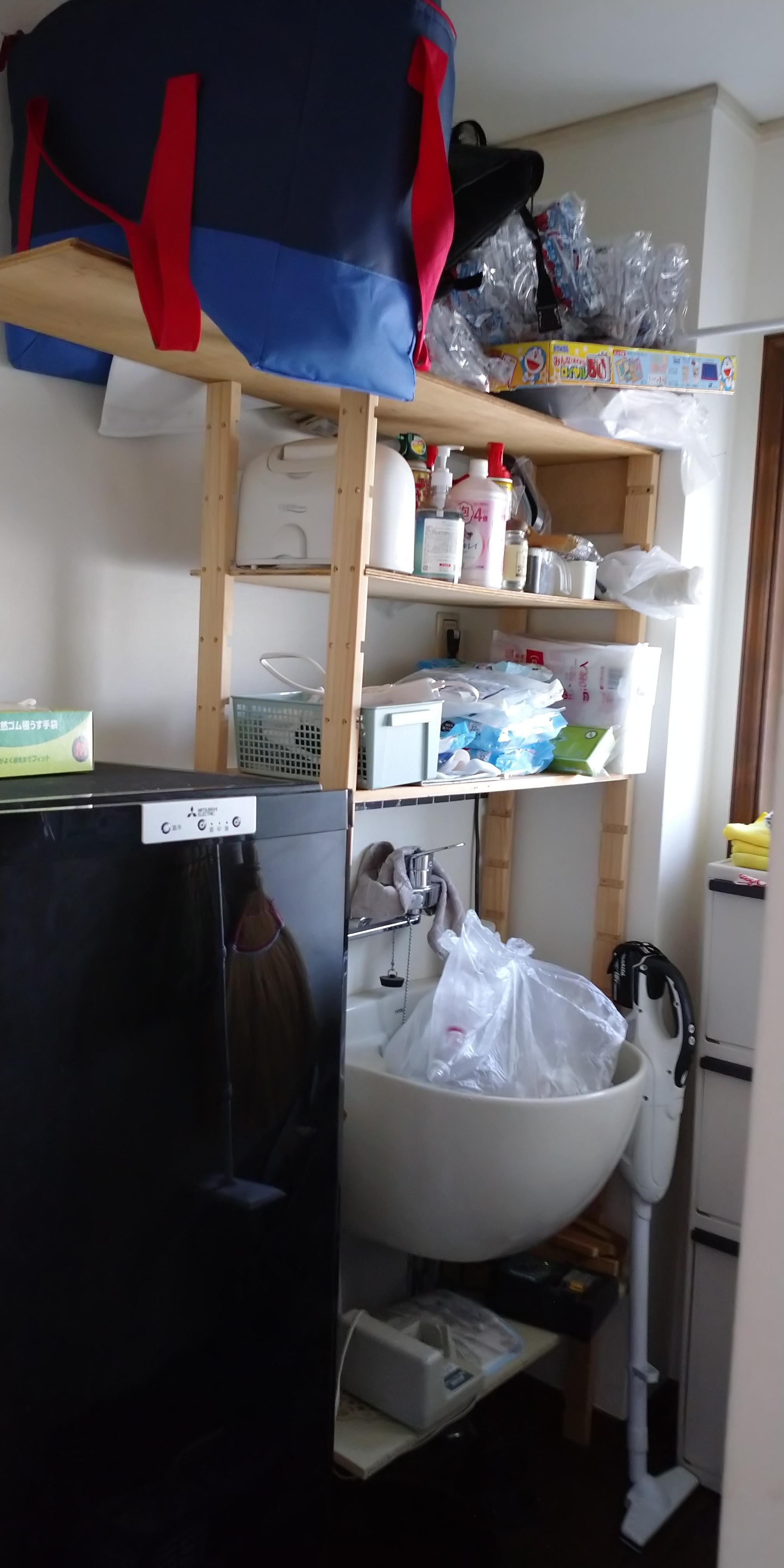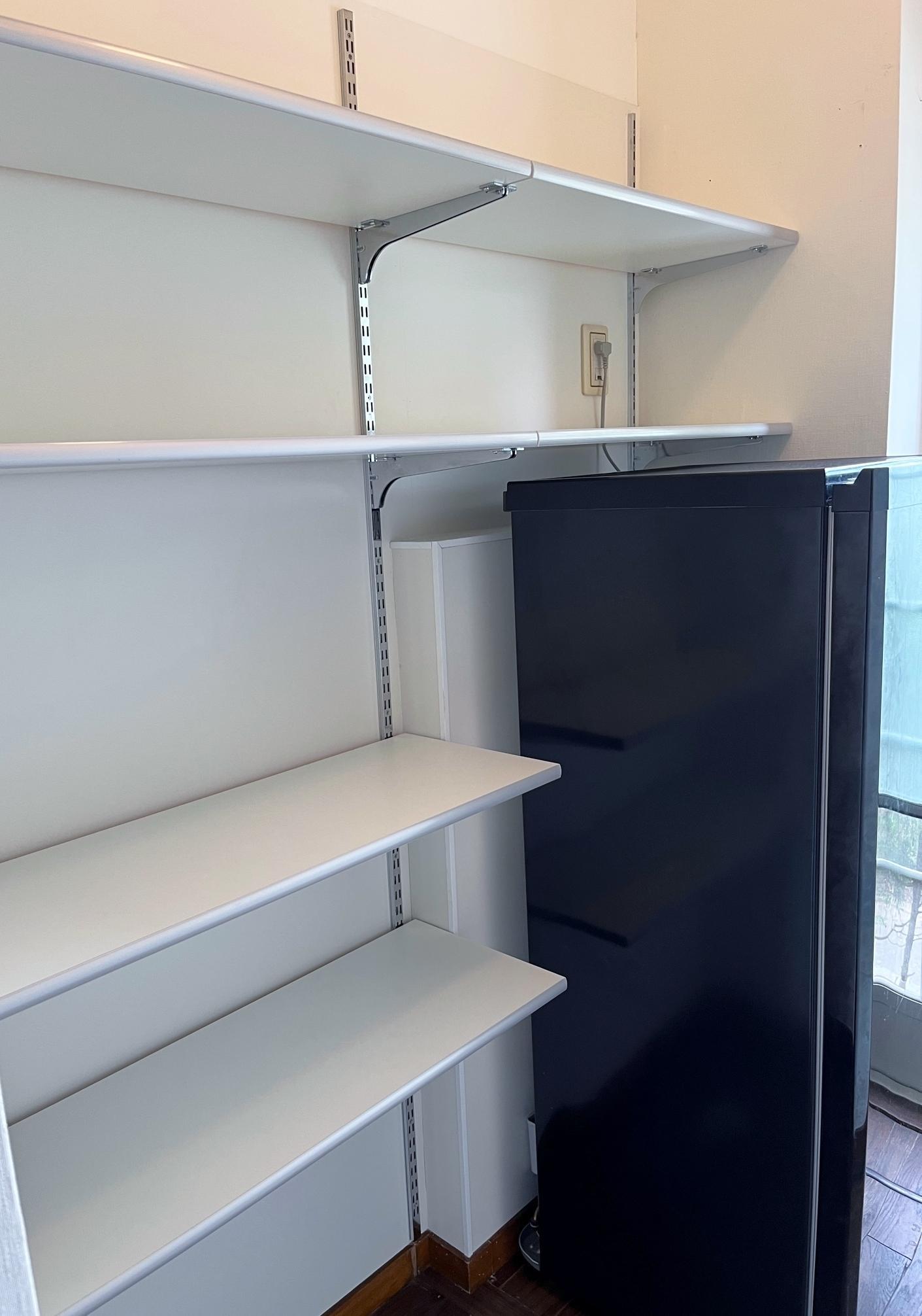 以前はスロップシンクがあったので、デッドスペースが多いと思っていました。 棚受けレールが背面に取付してあるので、両サイドの壁いっぱいに棚の上を使えるようになりました。 以前の棚は少し不安定でしたが、今度は固定してあるので安心で、たっぷり収納できます。