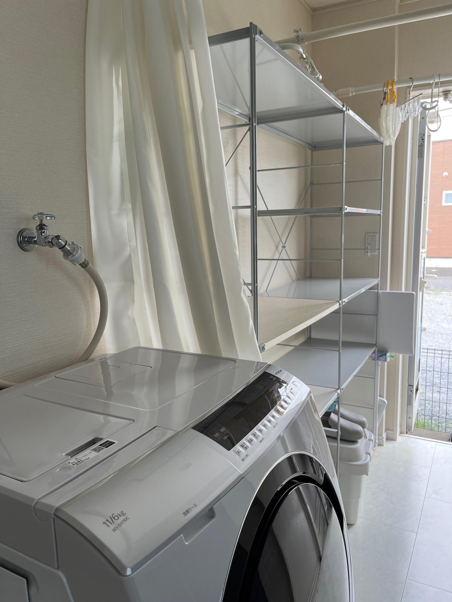 以前はスチール棚を置いて収納し、突っ張りでカーテンを付けていましたが、これからは、天井にカーテンレールもつけたので、スッキリとして収納もしやすくなりました。