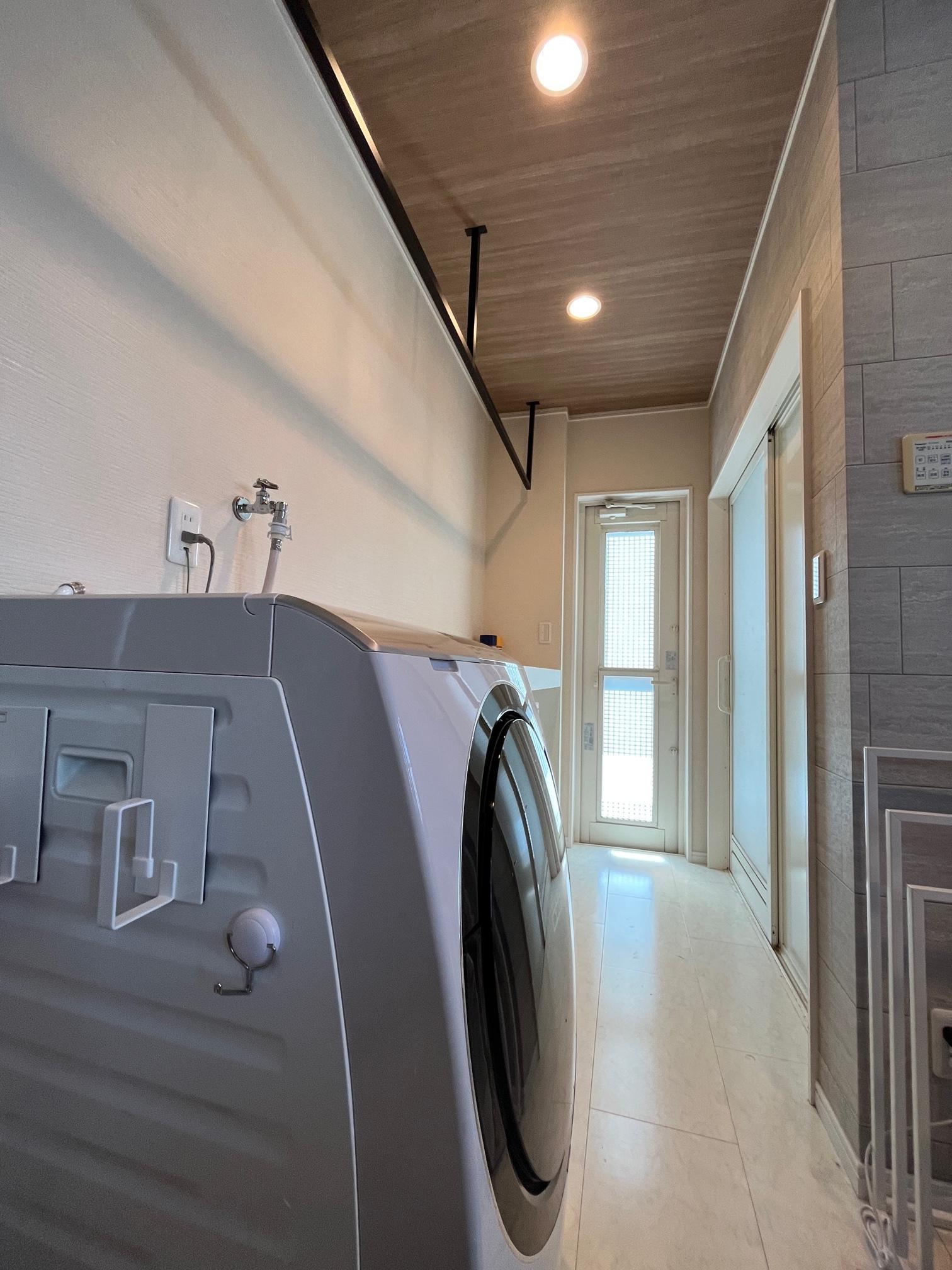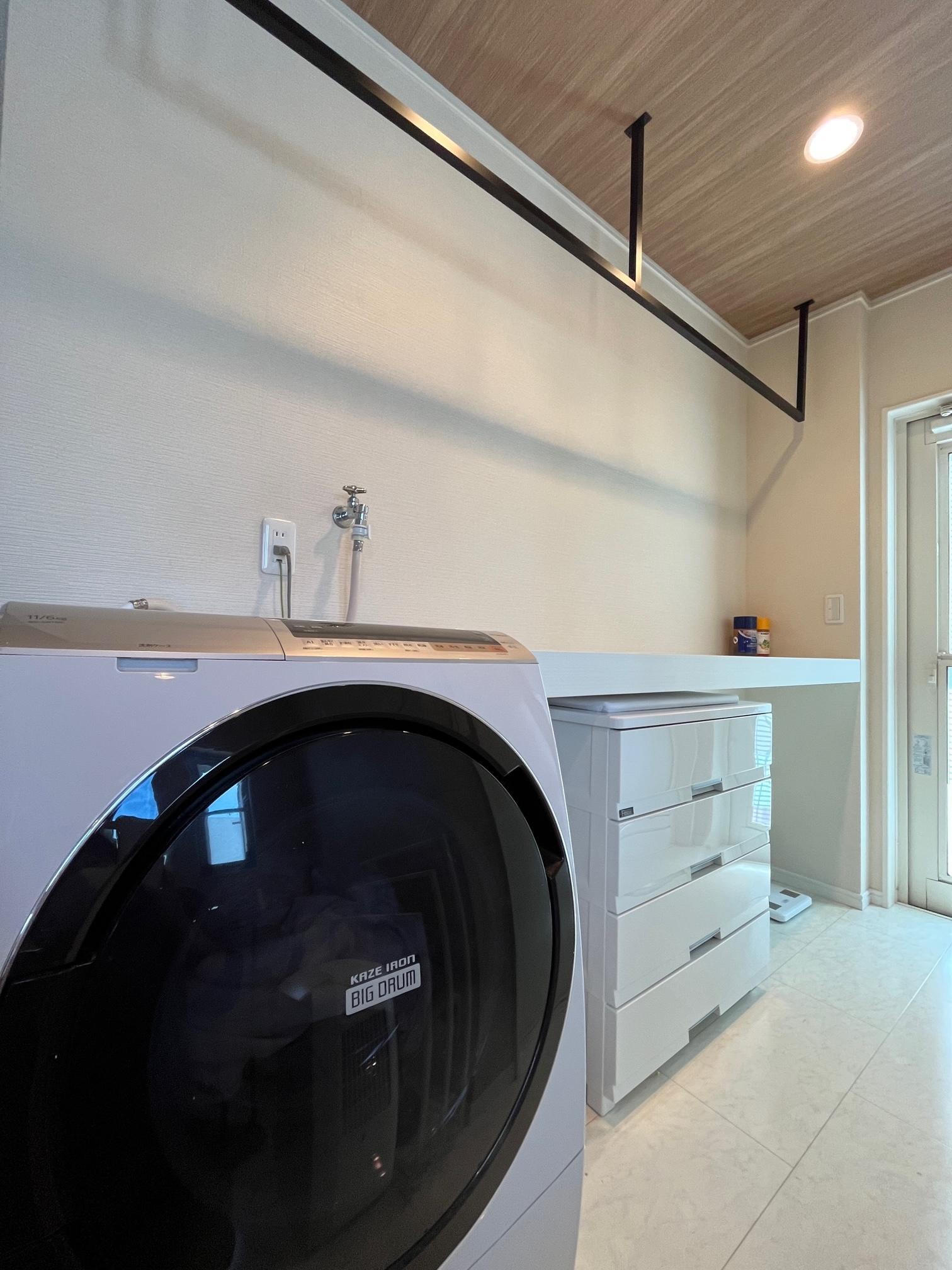 脱衣・洗濯室の上部にハンガーを掛けられる物干しを付けて、作業台も付けたいとご要望でした。 物干しはKacu(森田アルミ工業製)を、作業台は奥行きが45cm程度の物など、奥様のイメージがとても明確でした。クロスの選定もとても素敵です。