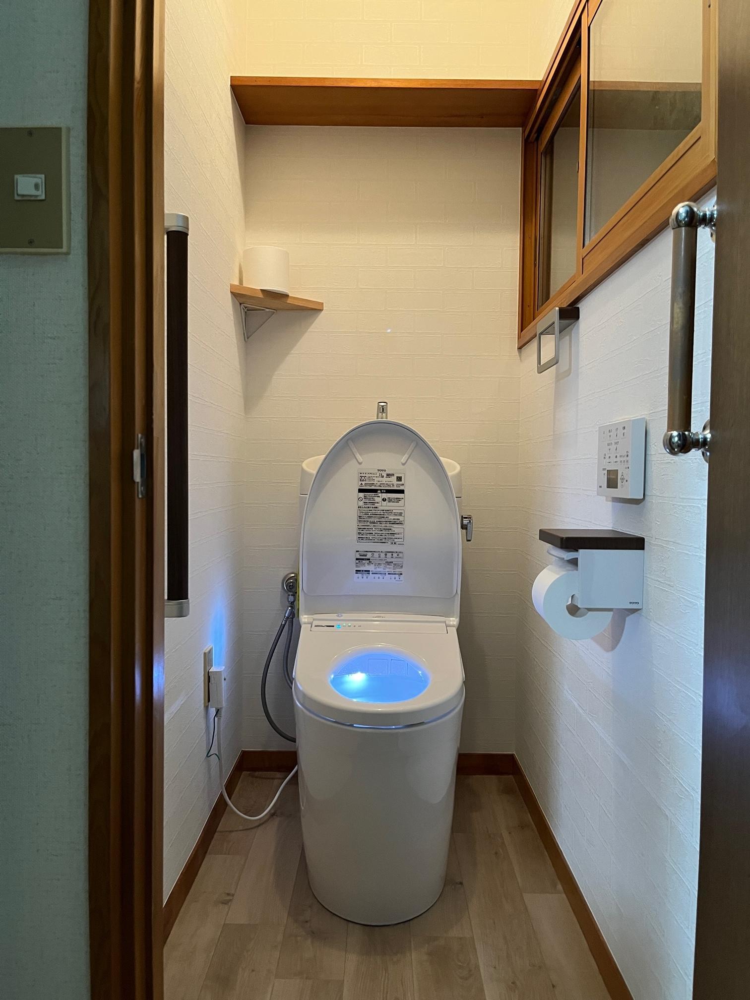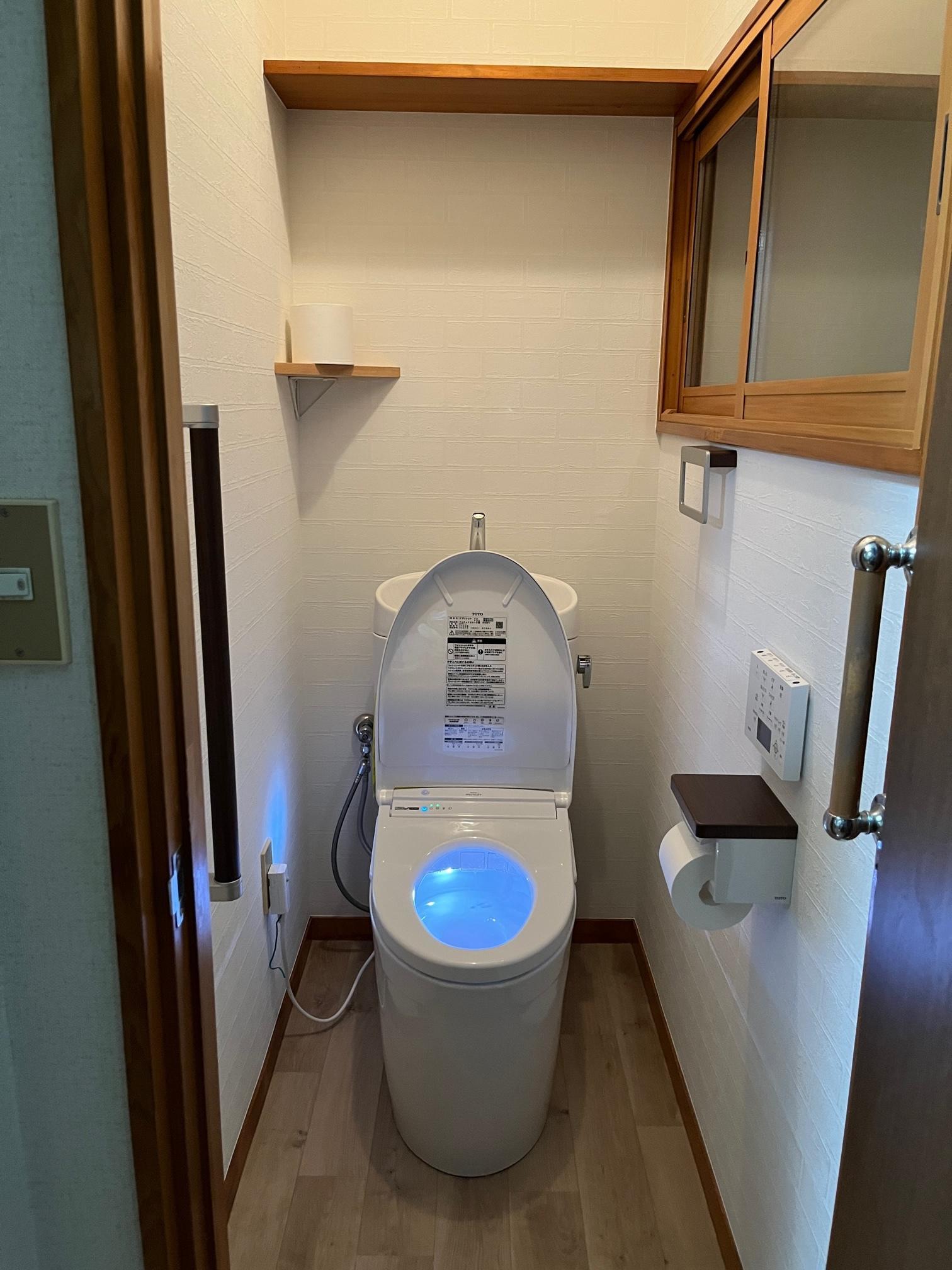トイレ改装工事のご依頼をいただきました。ご主人様はとても研究熱心な方でしたので、機種等はご主人様が選定されました。窓には冬の寒さ防止の為のLIXIL インプラスを設置しました。トイレペーパーを置く棚をコーナーに取付し、手をついても大丈夫なペーパーホルダーや手摺も壁面補強の上取付しました。