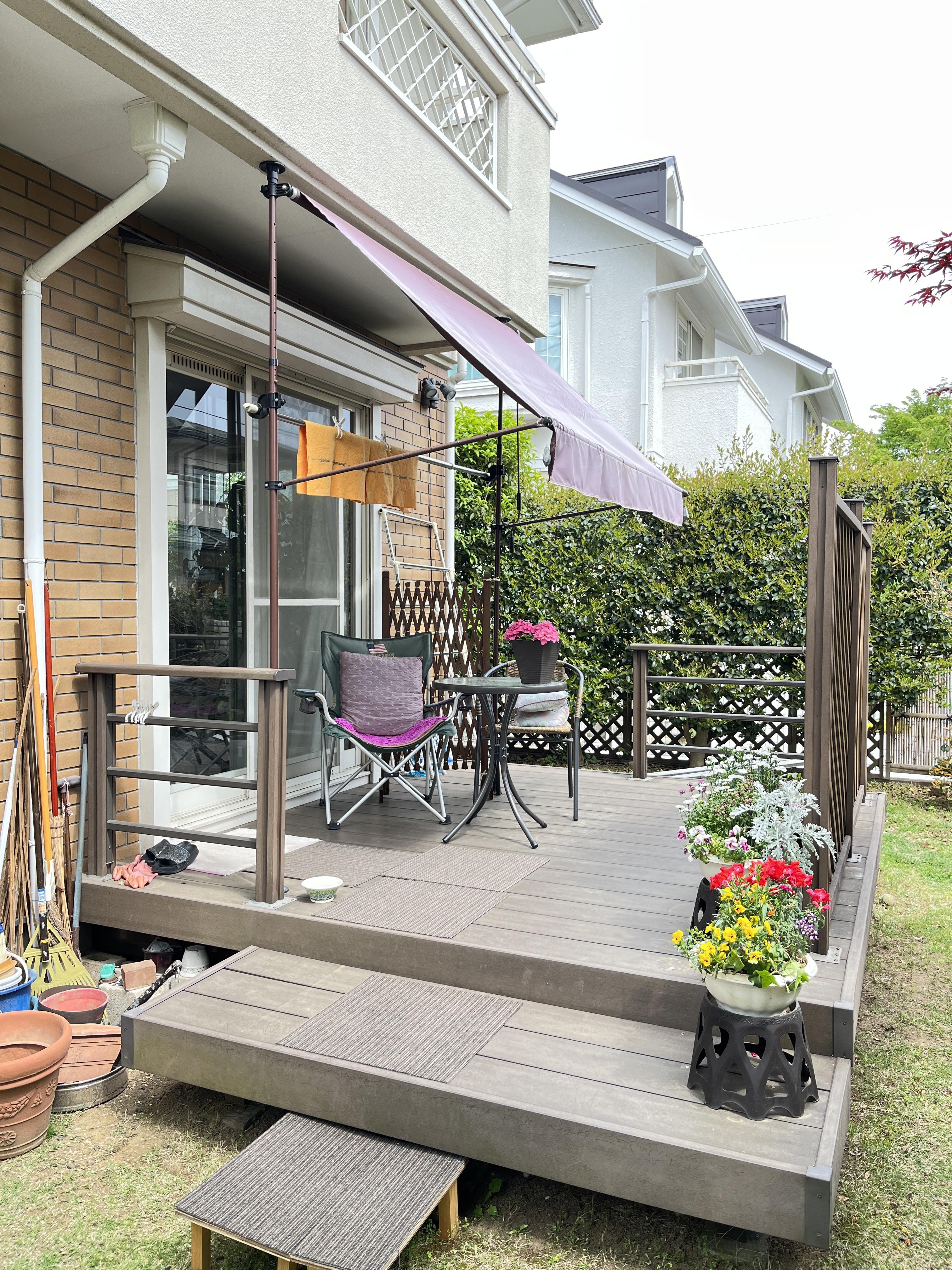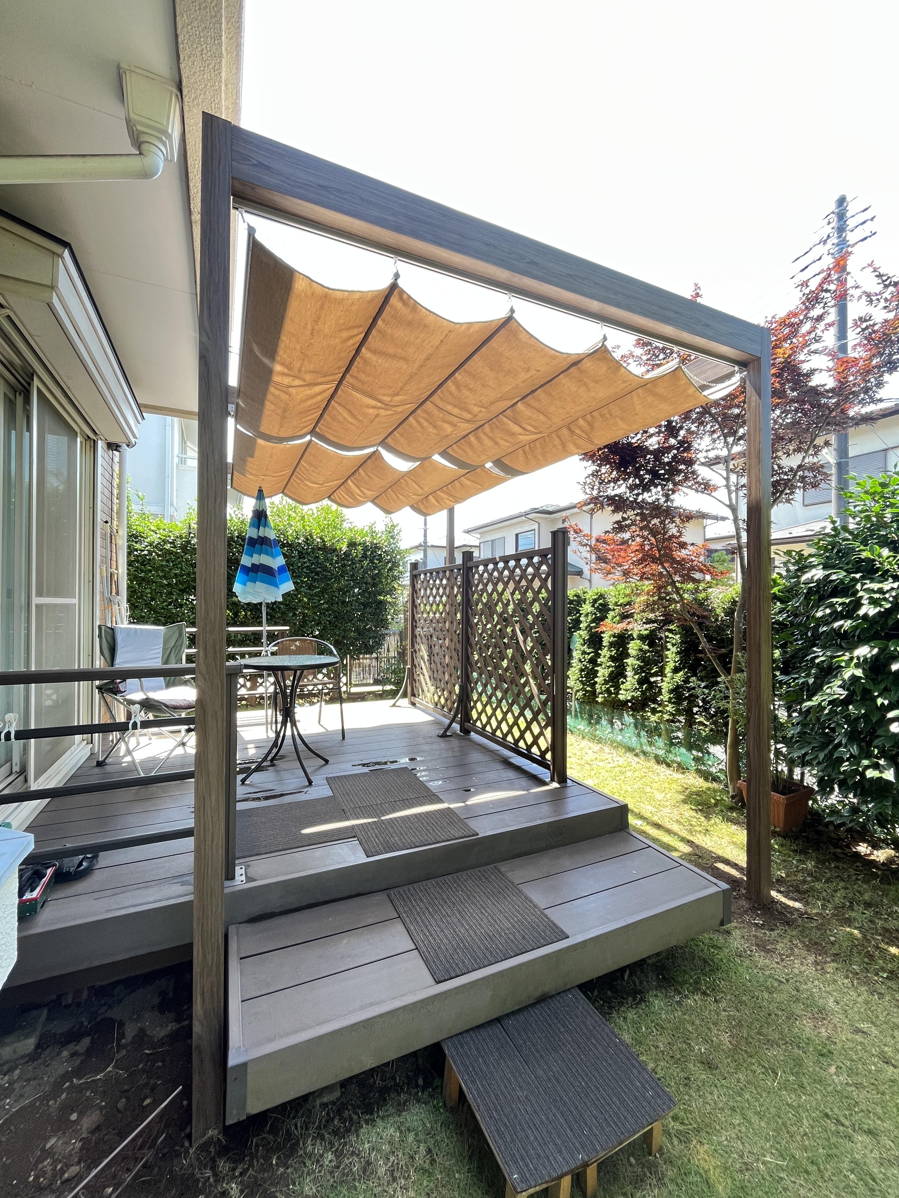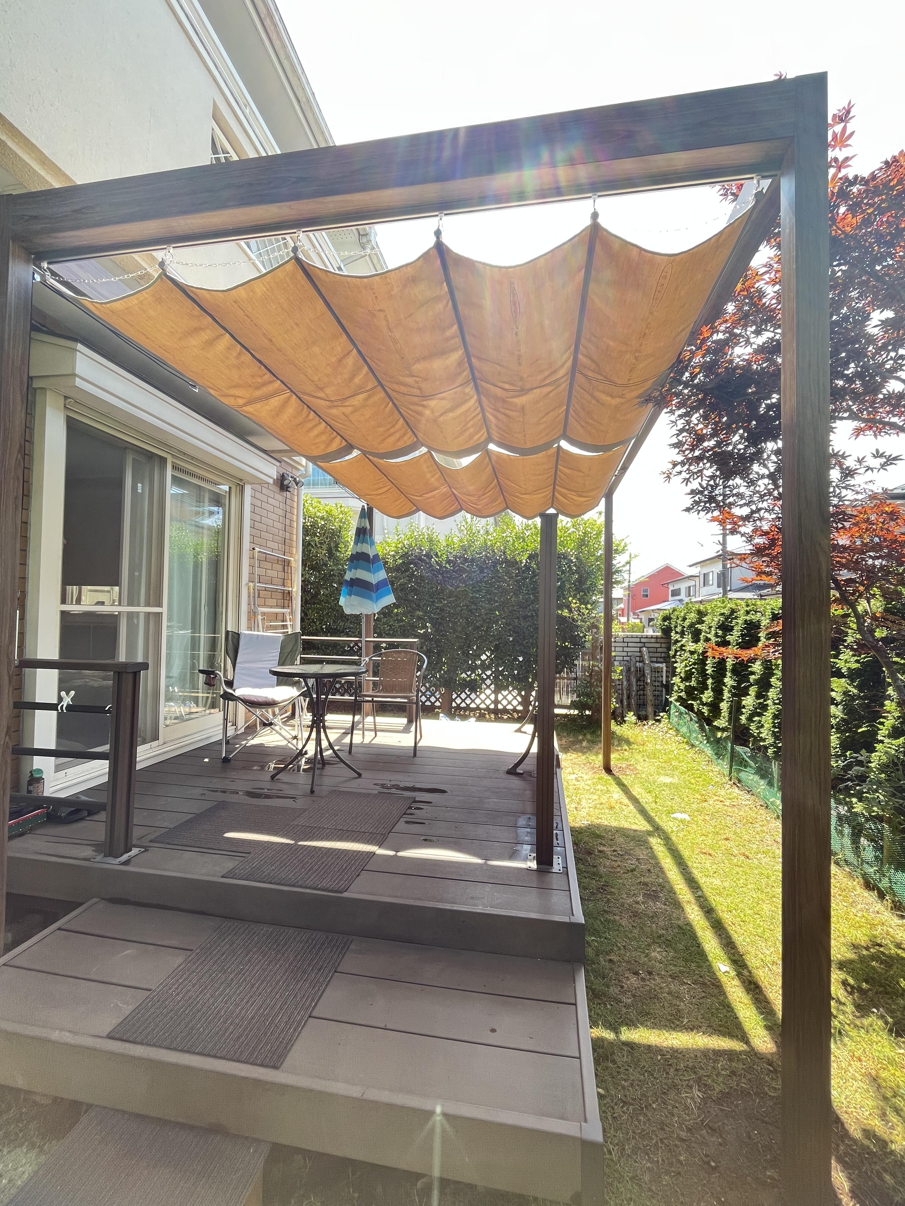 ウッドデッキにステキな日除けを付けたいとご相談をいただきました。柱とシェードの現物サンプルを取り寄せの上、ご確認いただき設置いたしました。「思った以上に好みの仕上がりになりました。」とお褒めのお言葉をいただきました。ありがとうございます。