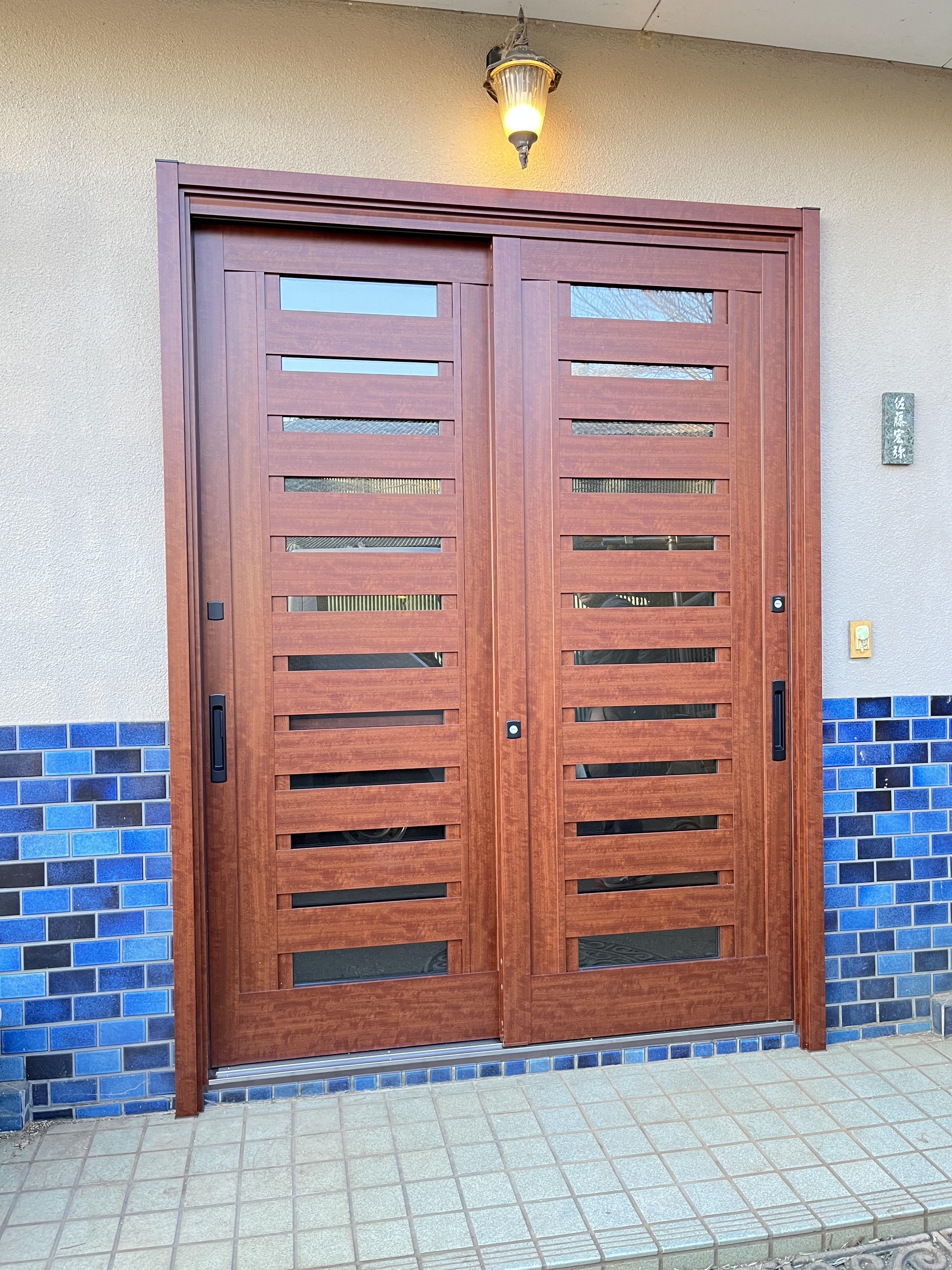 玄関引戸の交換を行いました。 リクシルのリシェントという商品を使用しました。 ドアを撤去し、枠は解体せずカバーして利用します。 そのため、工事は一日で完了です。