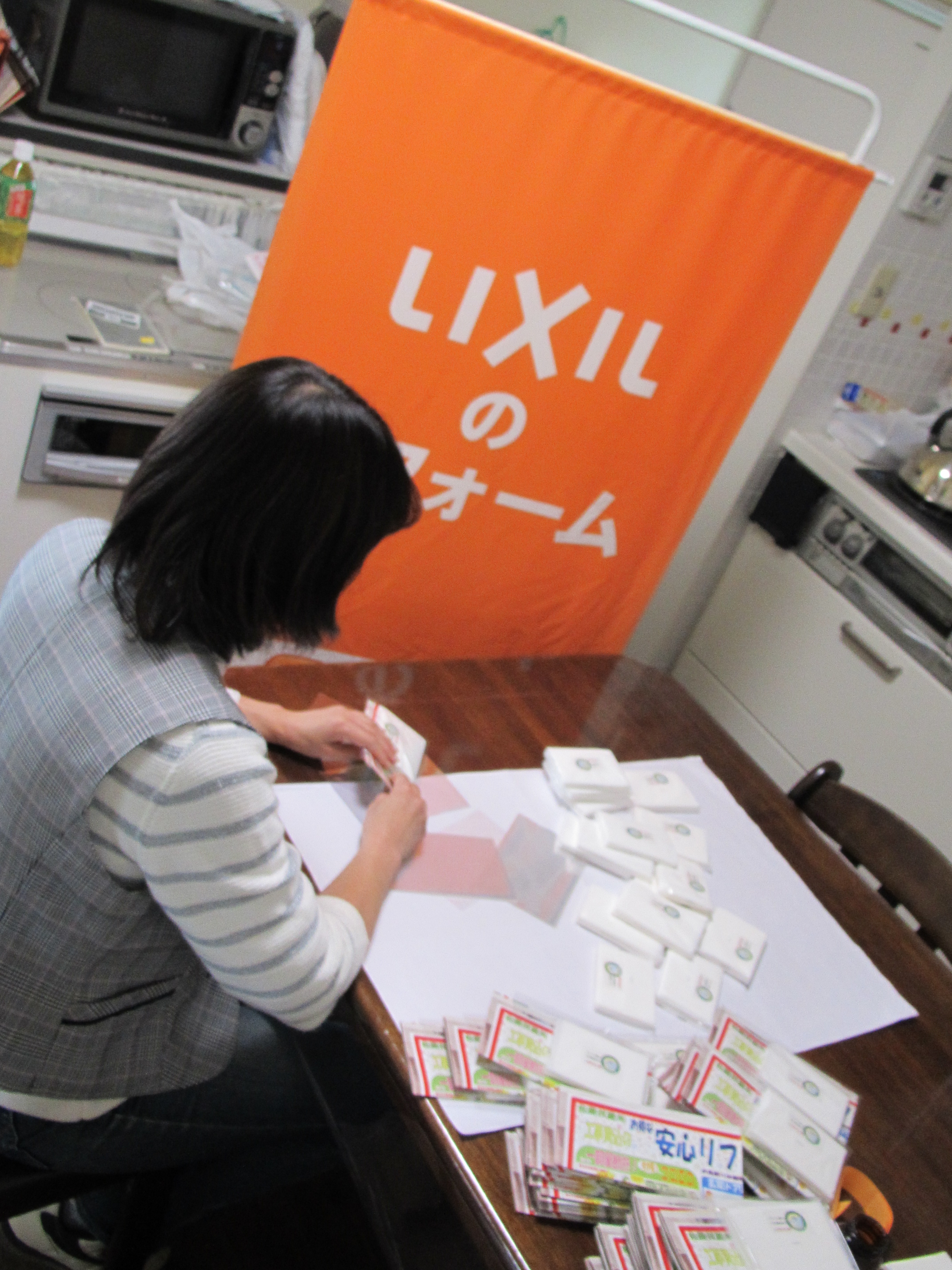 その時にお配りするチラシ&ティッシュをセットにする作業を行っています。