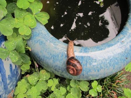 こんなに立派なカタツムリがやってきました!! ググッと火鉢の中を覗き込んでいるように見えます。 メダカは食べませんよね~?