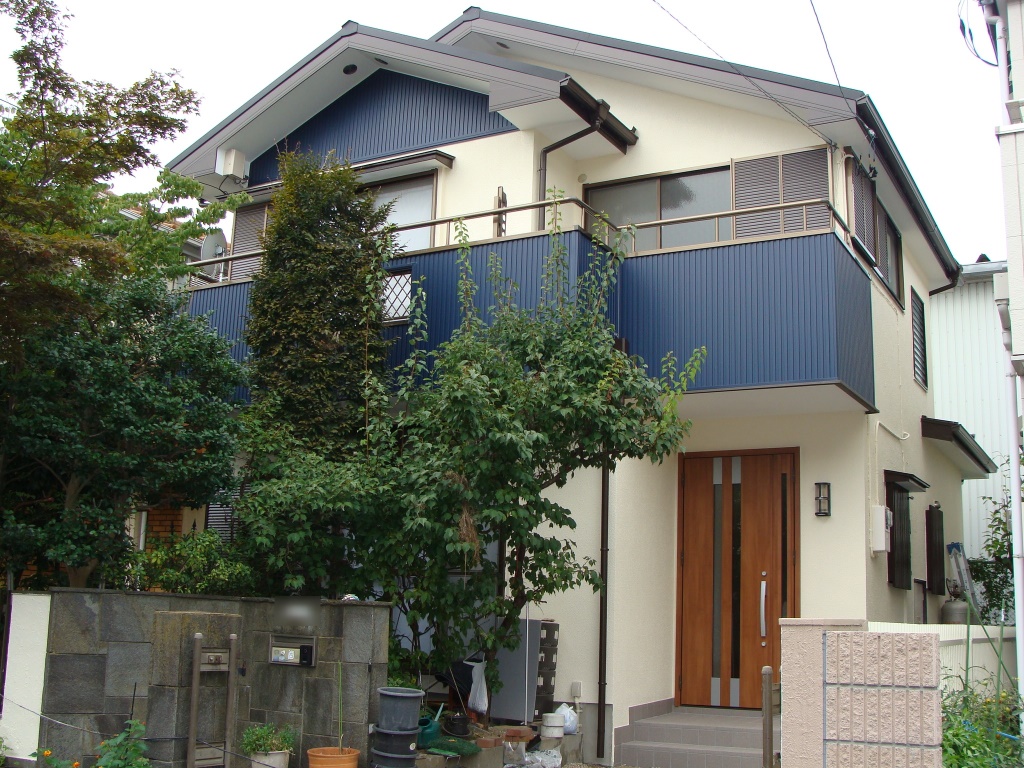 耐震補強工事をメインに、老朽化した水廻り設備やサッシ・内装・外装など全面リフォームしました。広げたバルコニーに施工したブルーのサイディングがアクセントになり、築34年の和風住宅が生まれ変わりました。
