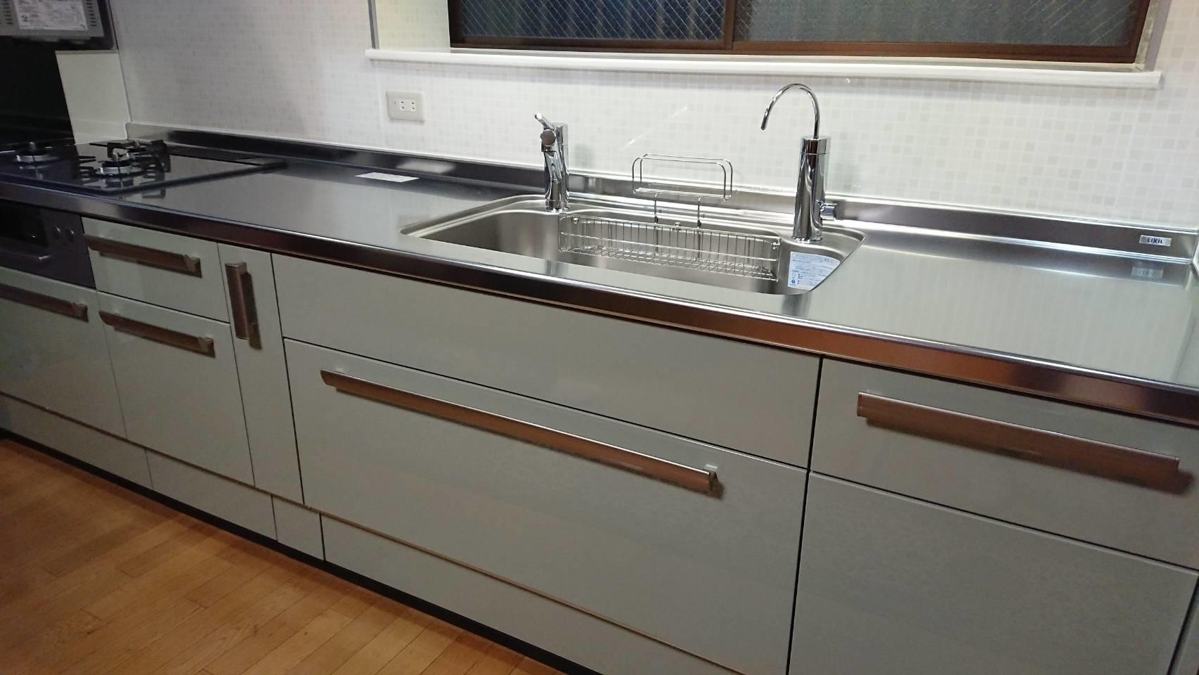 キッチンの下台のみ交換したい!とのご要望があり、既存の吊戸やカップボードなどとのバランスを考えて、選定しました。LIXILショールームにてカラーサンプルにてご確認いただき、リシェル セラドングリーンを選定。素敵に完成しました!