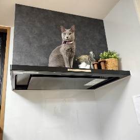 そして、、、、レンジフードに乗っている猫は人形ではありません(笑)猫ちゃんのお気に入りの場所になってしまたとか!リビングを見渡せるこの場所は居心地いいのかもしれませんね。