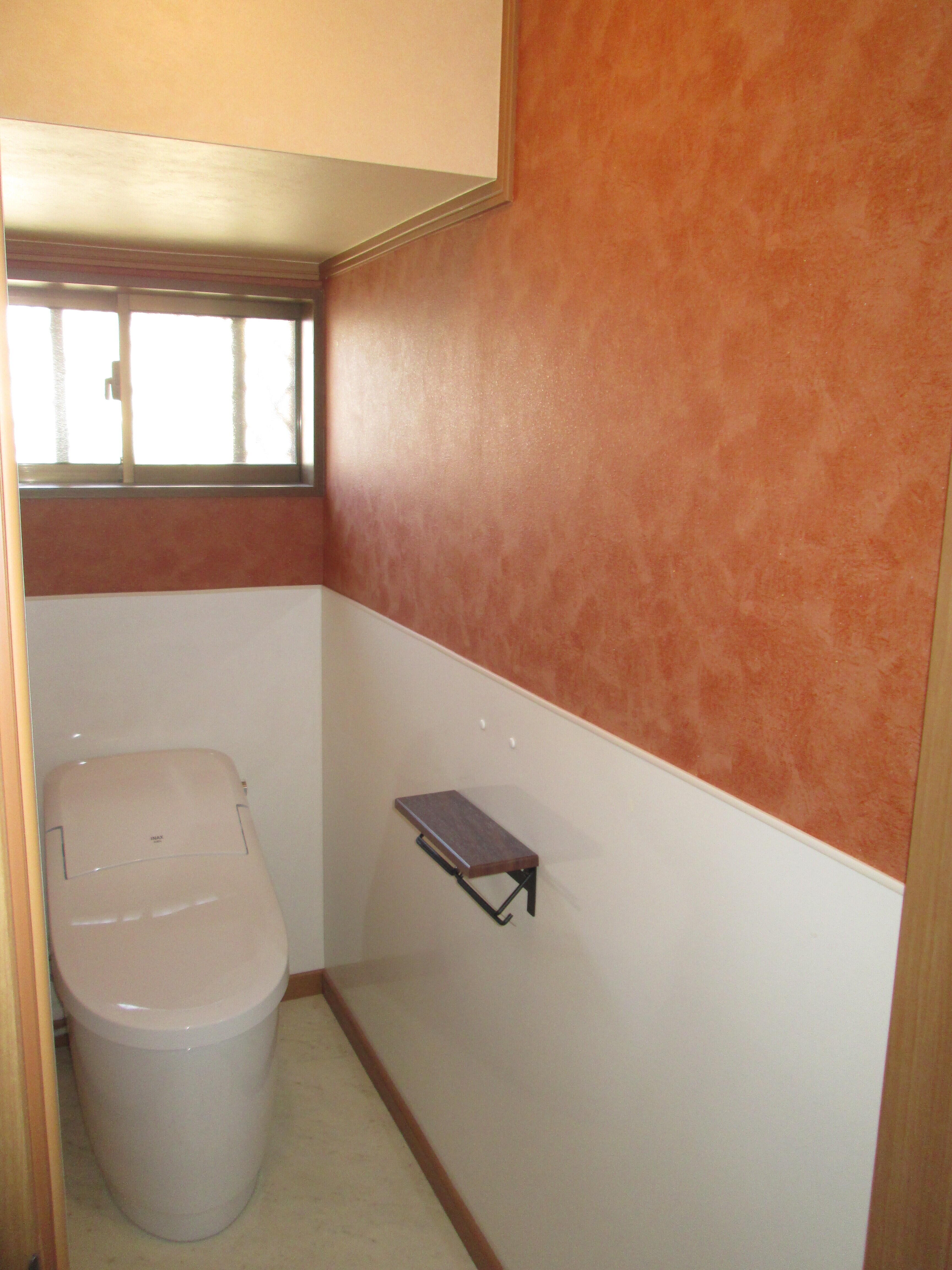 上部は鮮やかな色のクロスで仕上げ、素敵なトイレ空間に!