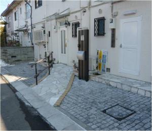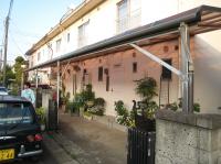 規則正しく並べられた石と乱貼りの石とのバランスをオーカー色を取り入れることで柔らかい雰囲気を出した。以前の大きな屋根の閉塞感、圧迫感を取り除き、シンプルなクリアルーフを使った。[Before] この近辺は道路と建物との勾配が厳しかった為レベルを合わせるのみ苦労しました。 [After]手前側は車が入る為あえて、大きいサイズの石を敷き、石畳の持つ強く硬い雰囲気で引き締めた。