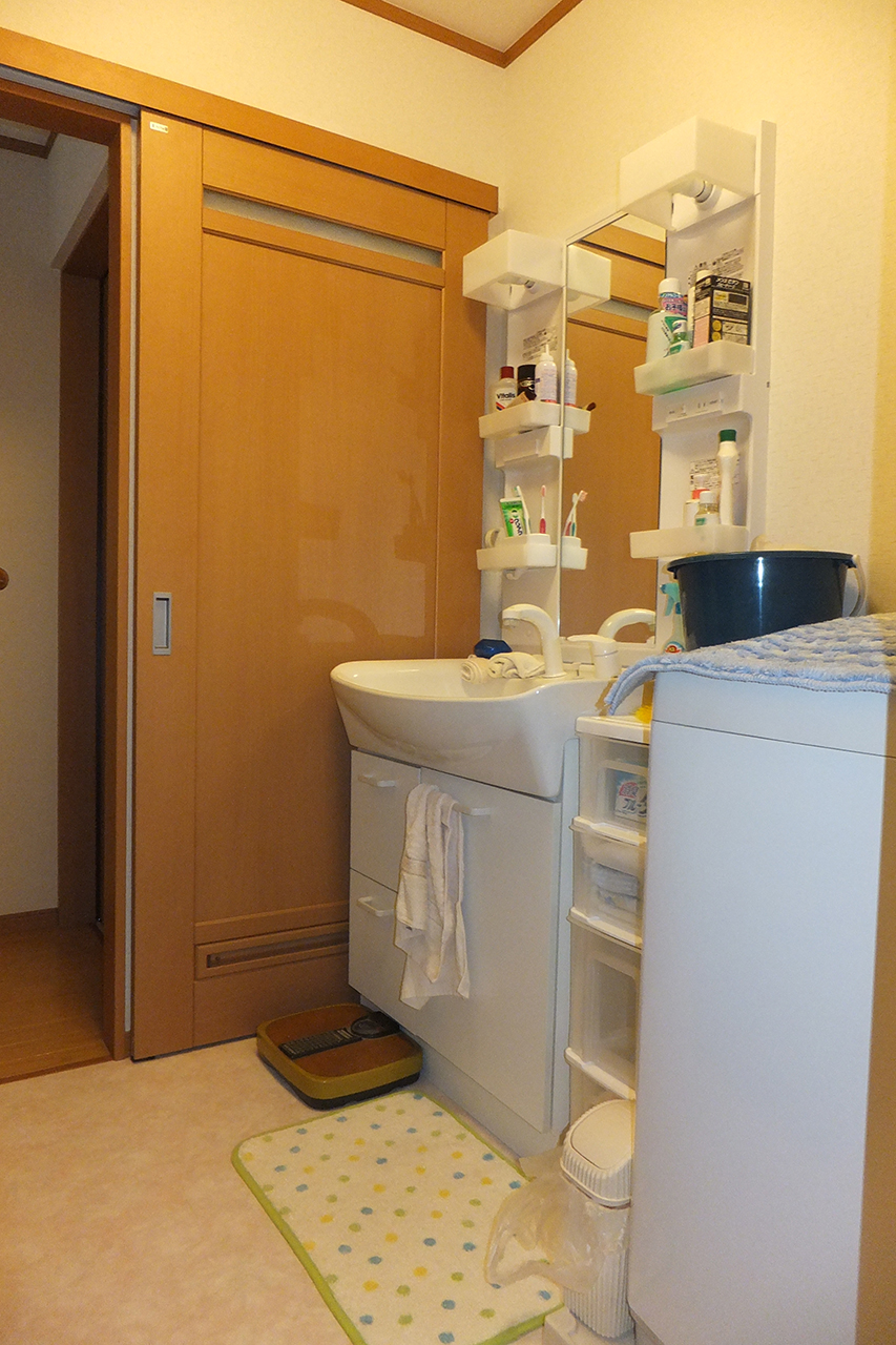 ガラス戸とカーテンのみの仕切りで寒かった洗面、洗濯機置場が無く外のため洗濯がつらい毎日が、間取り変更に伴い洗濯機置場を室内に、床をバリアフリーにするために引戸に変更。トイレ内から洗面器を外し洗面所へ設置。選択の際も寒さ知らずです。