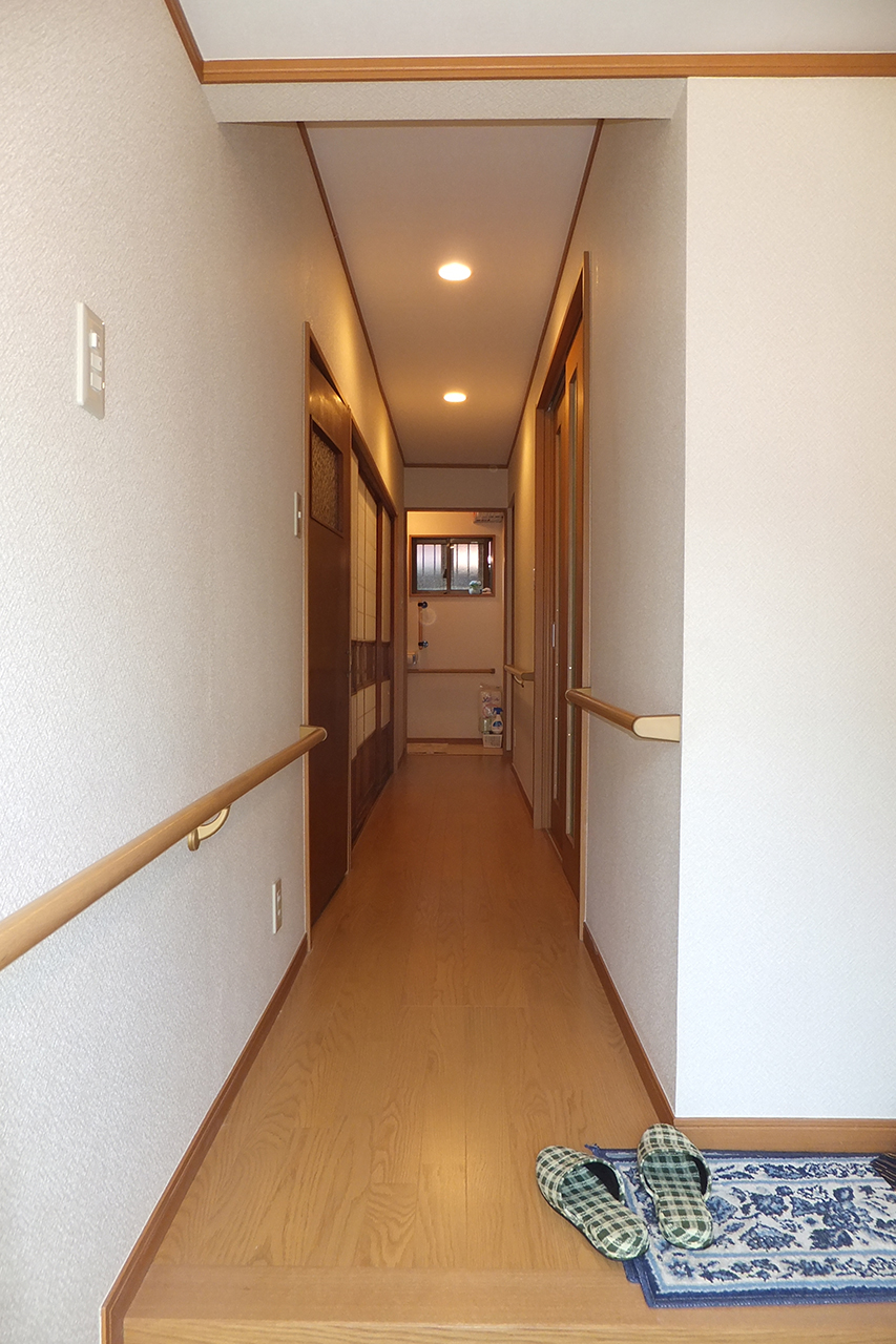 段差のある暗い廊下。障子のため、手摺を付ける事が出来ず足の悪い母親がつかまる手摺がつけられない状態でした。リフォームでは照明を増設し部分的に壁を作り手摺を取付。実際に使う奥様に持っていただき高さを確認、特に土間部分は高さを替えて土間から廊下に上がりやすいよう配慮。