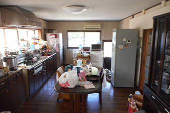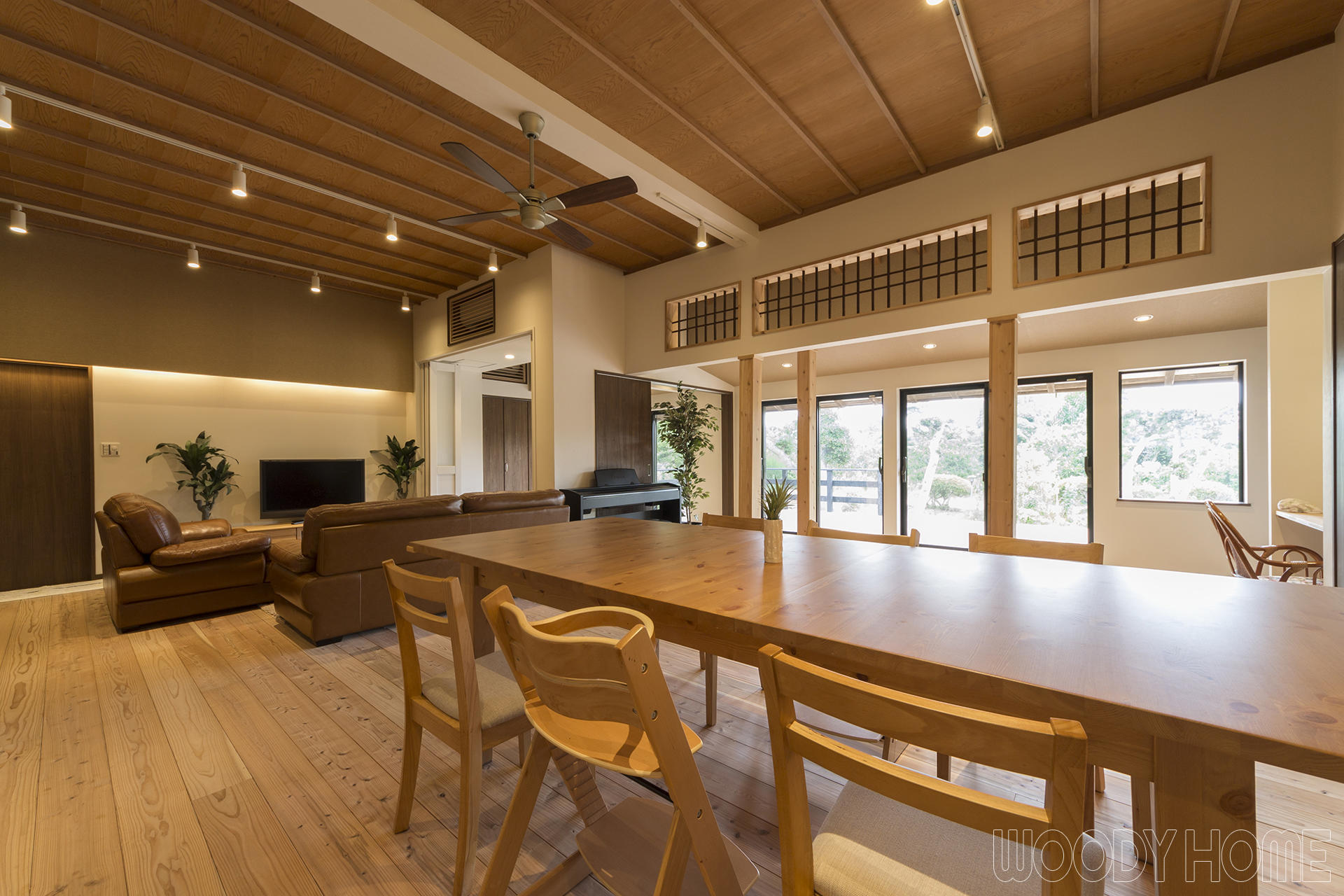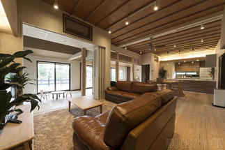 既存の天井を活かしフローリングとクロスで仕上げたリビングは、日中は窓からの採光で明るく、夕方以降はスポットライトと間接照明でくつろげる空間に。掃き出し窓はそのままウッドデッキへと行き交えるリゾートホテルの様な空間。