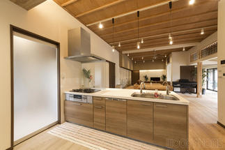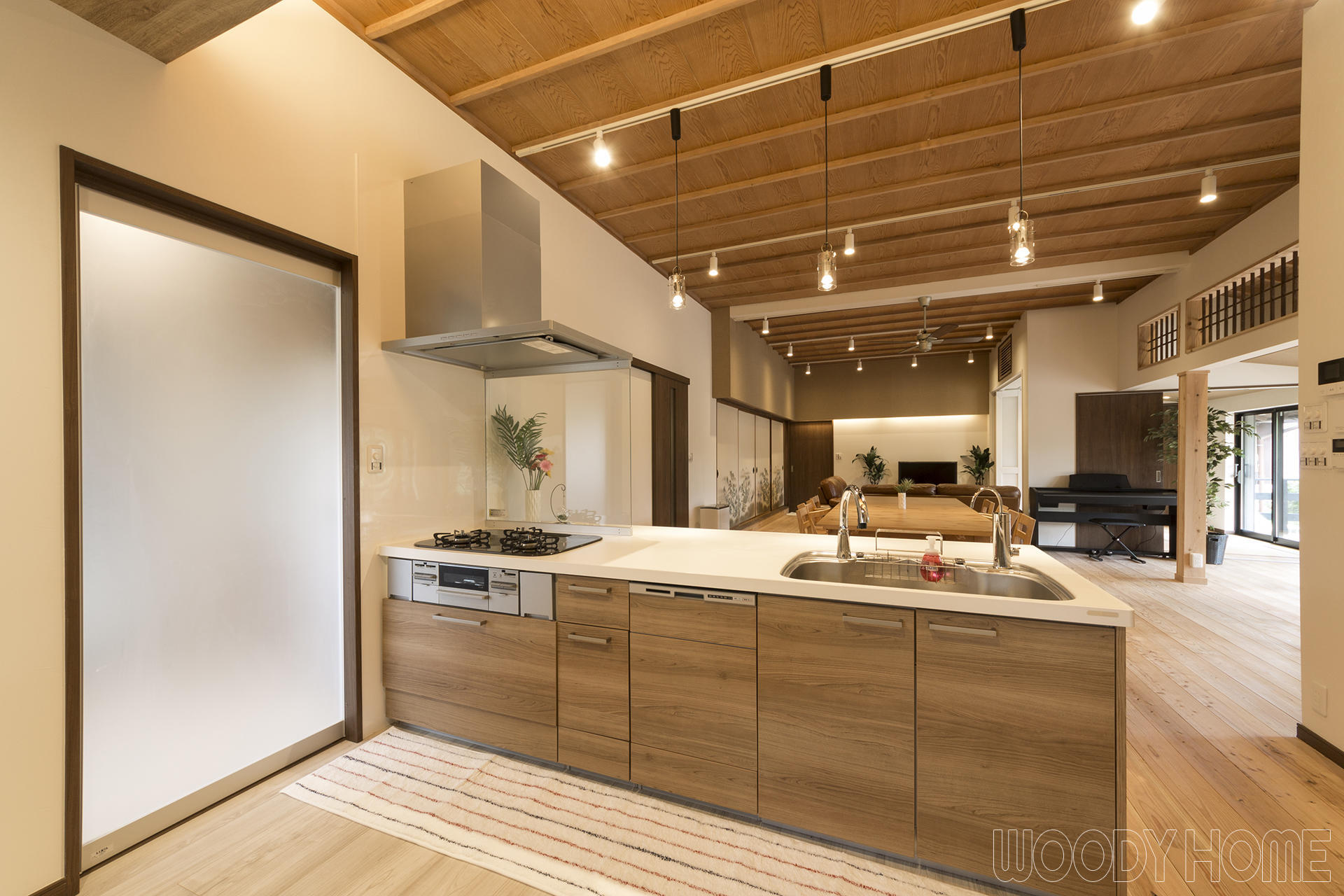 ペニンシュラレイアウトで設置されたシステムキッチンはLIXILのアレスタ。背面の収納と隣接する家事室で収納に困る事なく腕を振るえます。