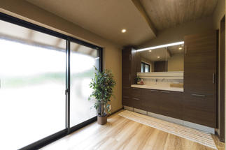 収納力も豊富な洗面脱衣室。生活感を感じさせない様に、洗濯機などは建具で隠しています。窓からウッドデッキに出れるのでお洗濯干しも楽々。