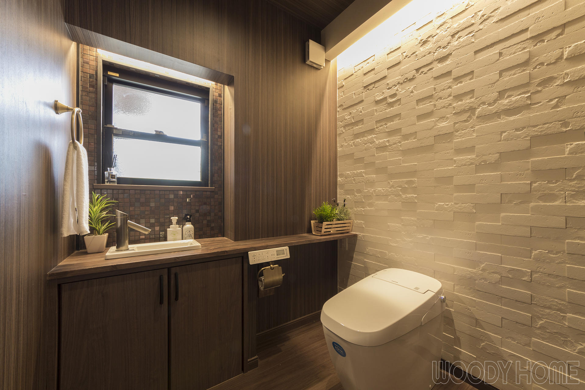 お施主様のこだわり空間の一つです。広さは一般的な住宅のトイレの約2倍、便器はアクアセラミックでお掃除が楽なLIXILアメージュ。エコカラットやモザイクタイルなどこだわりが詰め込まれています。