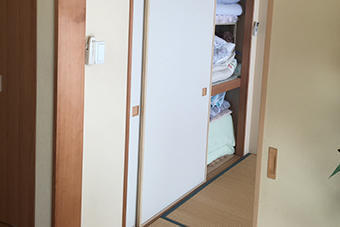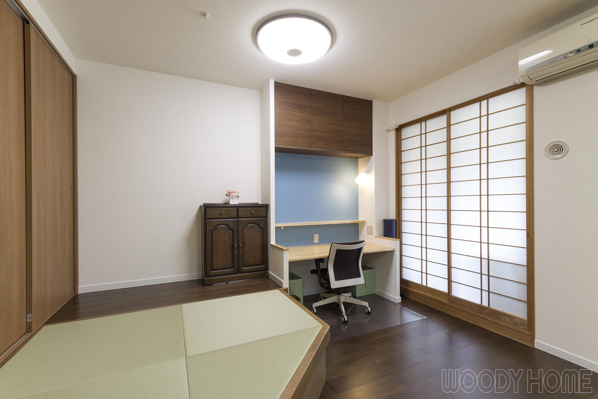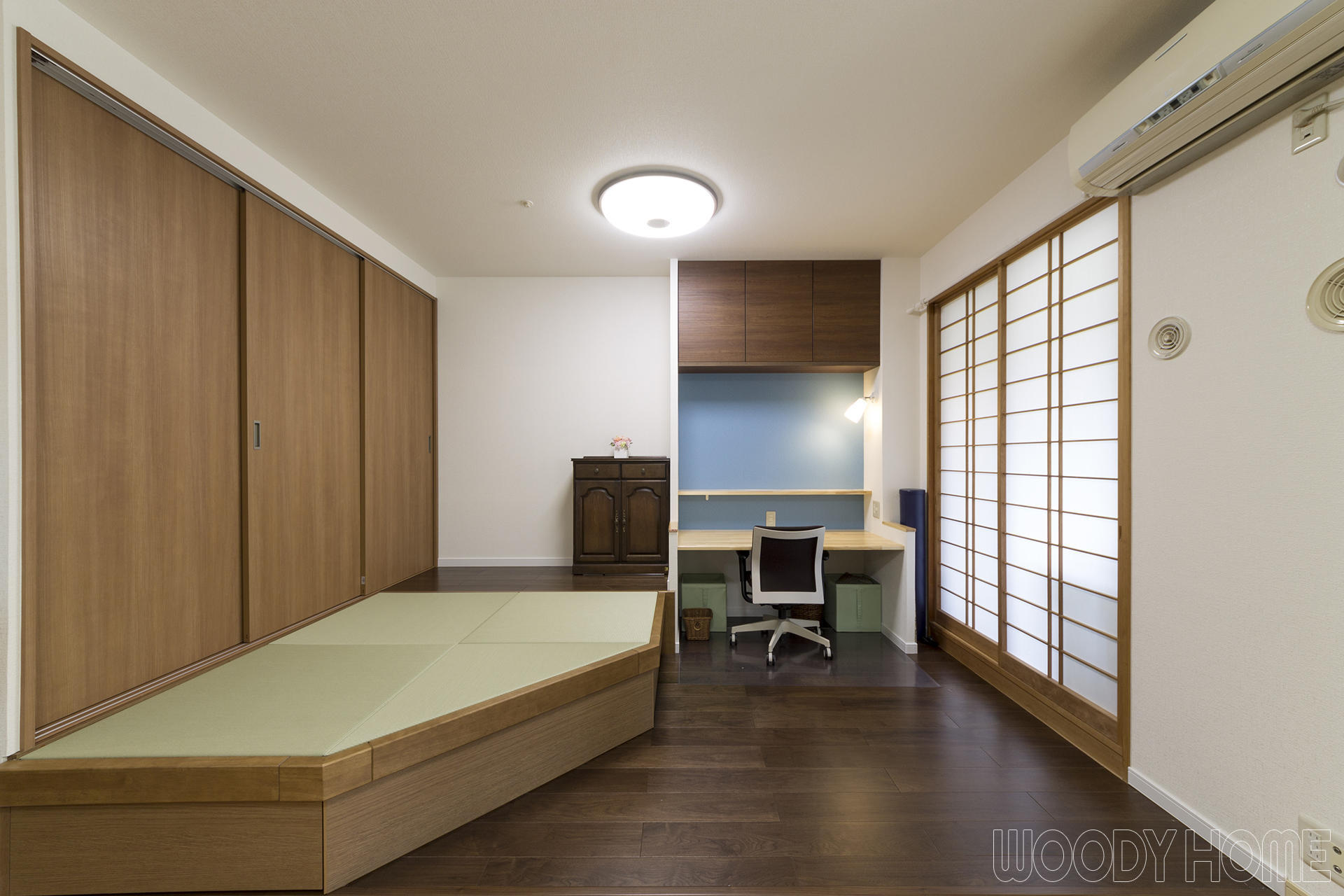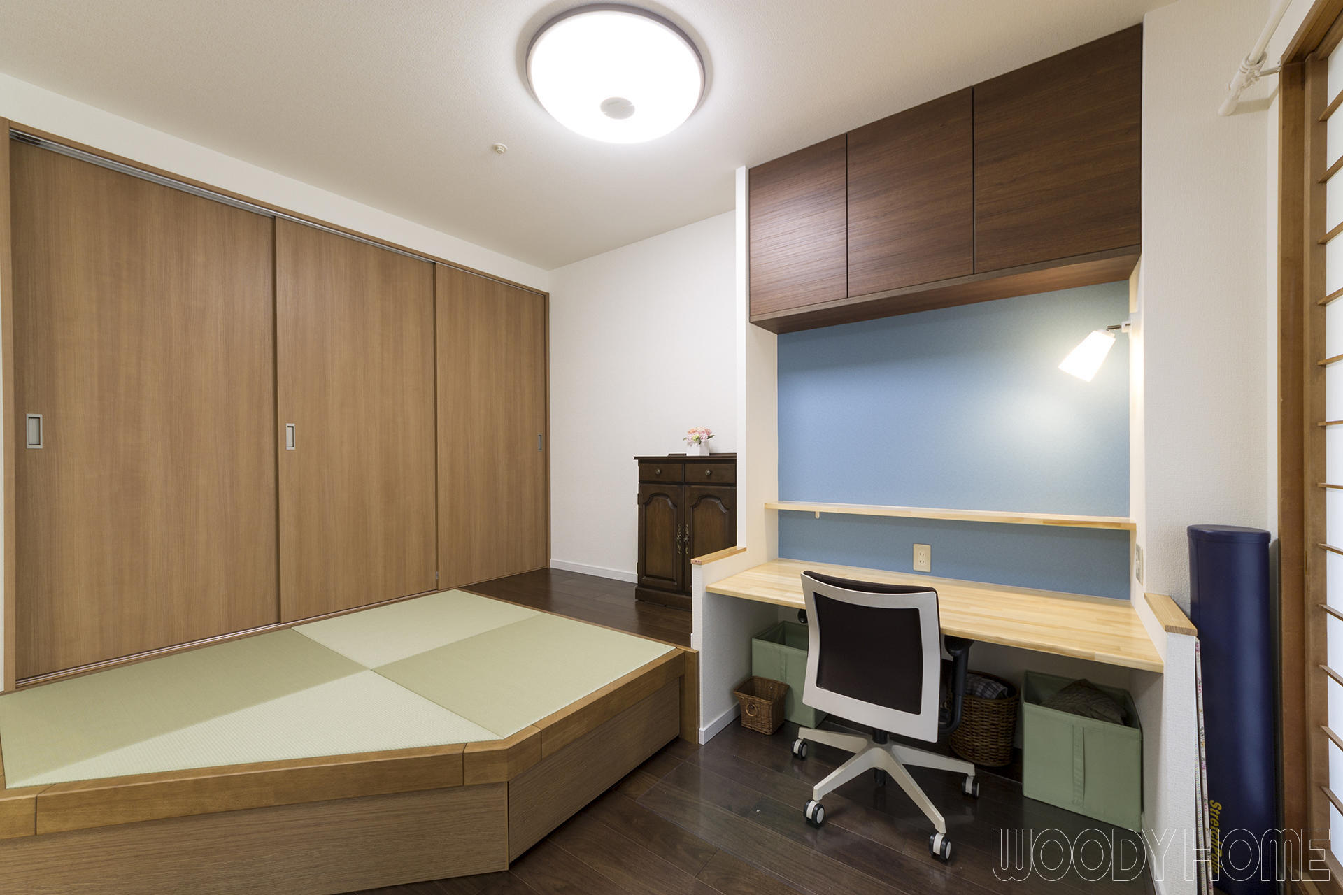 襖で仕切られて狭く感じます。押入れ部分も今回改装いたします。畳部分は残したいとの事で、畳が丘をご提案いたしました。リビングとの壁が取れた分広くなり大きな部屋になりました。畳が丘を設置したので中に収納もできます。三畳半くらいの畳スペースですが、座ったり寝転んだりできます。また、お母様の趣味の机を設置し、アクセントのクロスを貼りました。既製の机を置くのではなく、お母様に合せた造作の机なので趣味の作業がやり易くなりました。