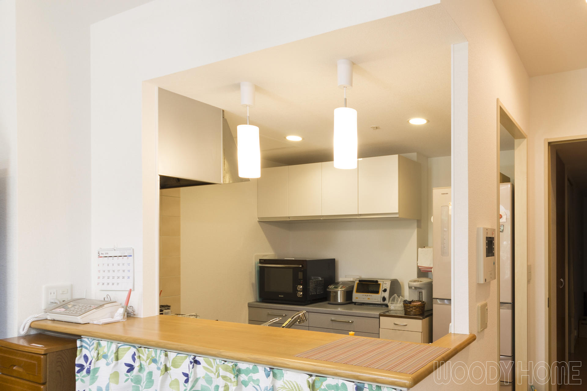 対面キッチンですが、下がり壁・吊戸に囲まれて暗く孤立していました。,br /> 吊戸を外して新しい吊戸を背面側に付け、下がり壁部分を無くしてブラケット照明を2灯付けました。開放感が出てLDKへと変わり明るくもなりました。