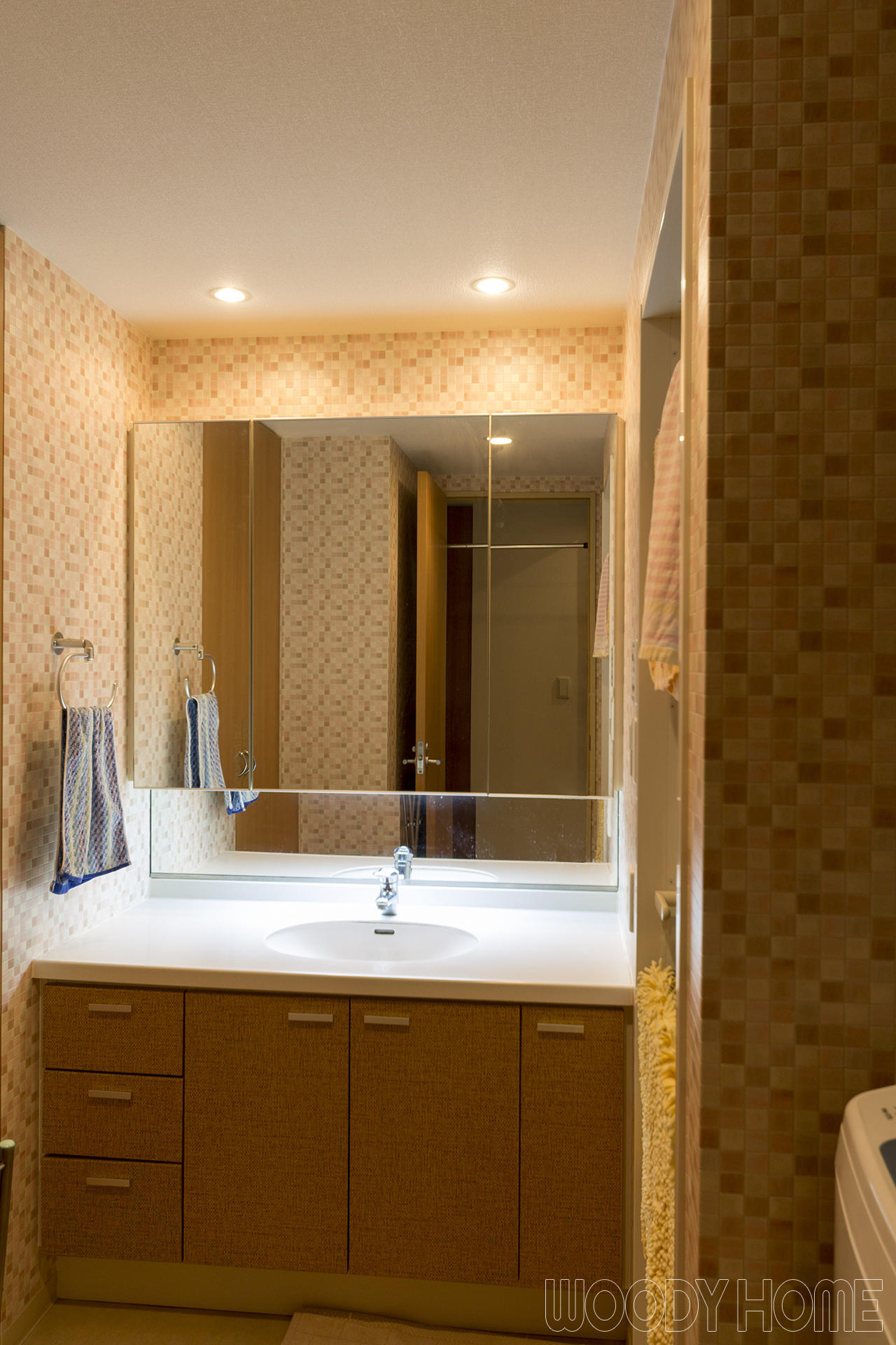お父様が選ばれたタイル調のクロスへ貼り替えましたが、とても綺麗に洗面化粧台が引き立ちました。