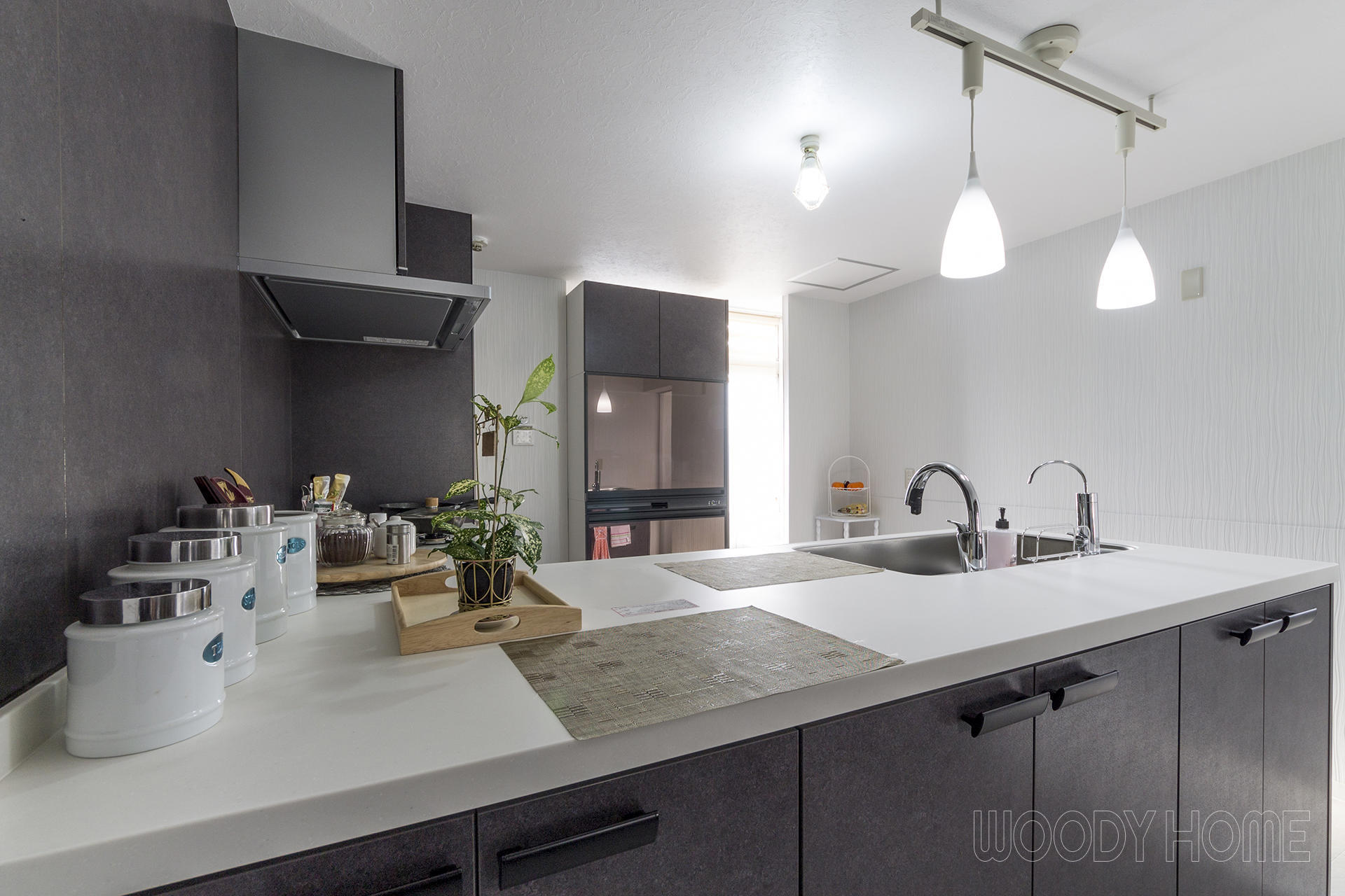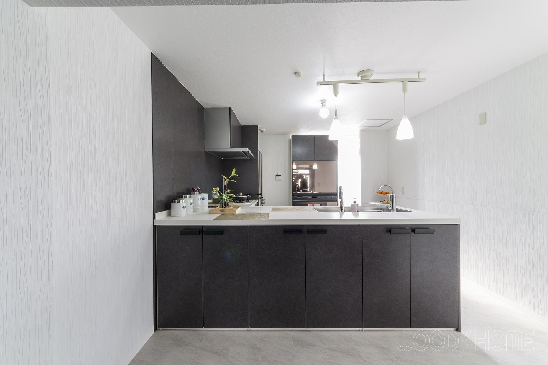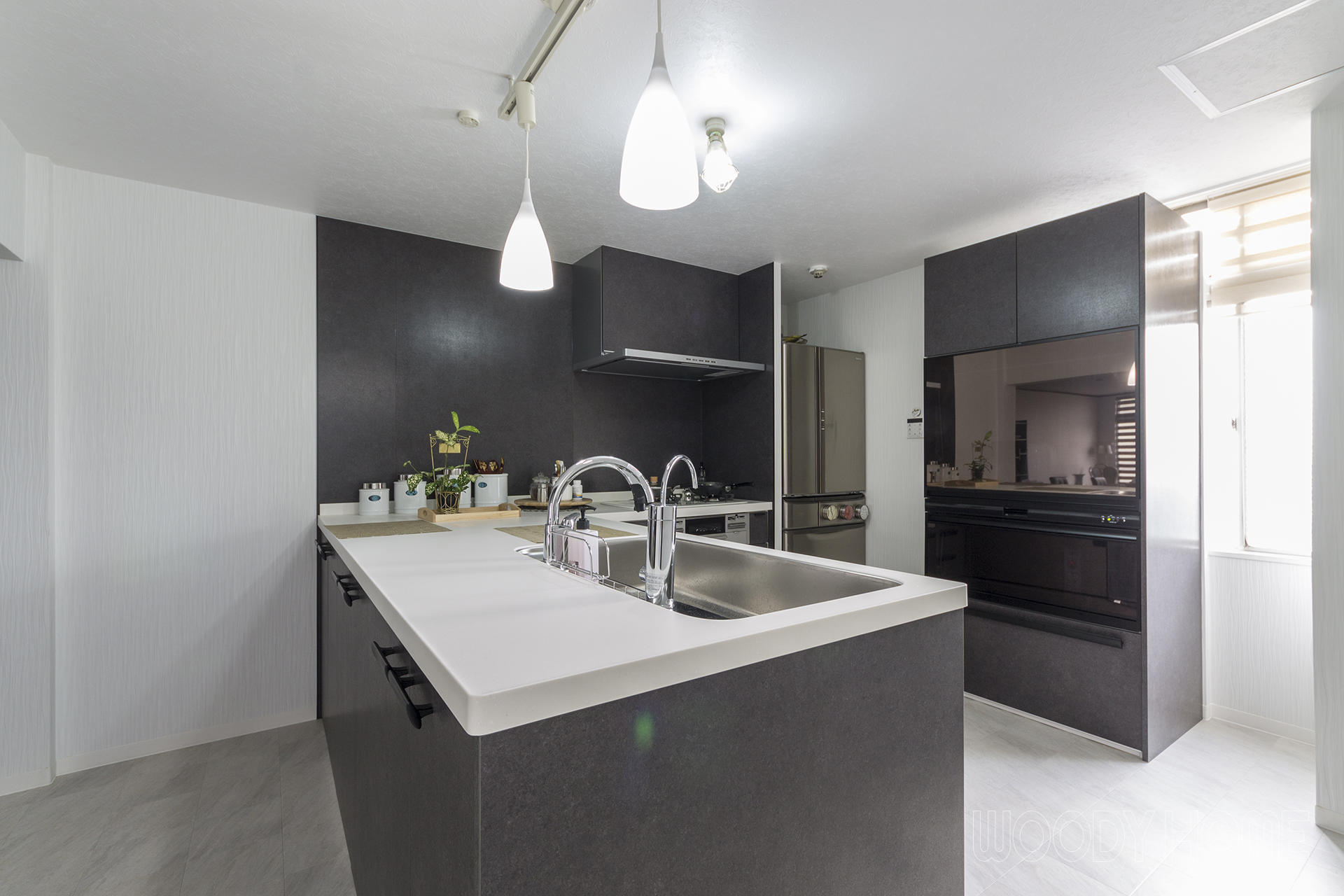 LIXILのリシェント対面収納付きをL字形レイアウトにしての提案。色味もモノトーンでまとめました。収納量も増えて使いやすくなりました。