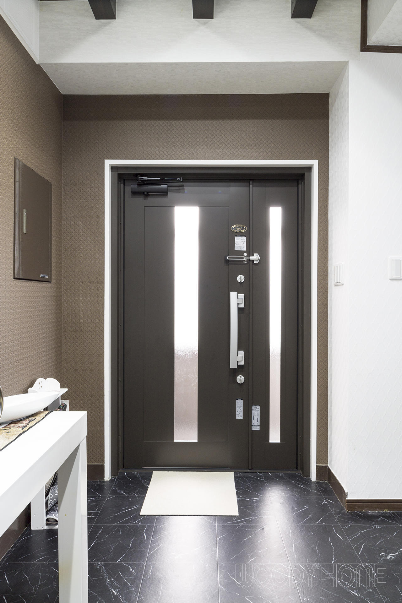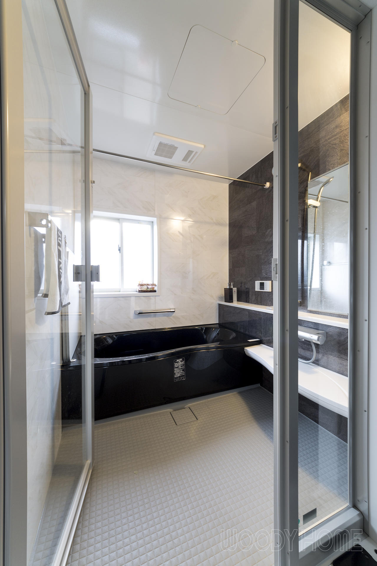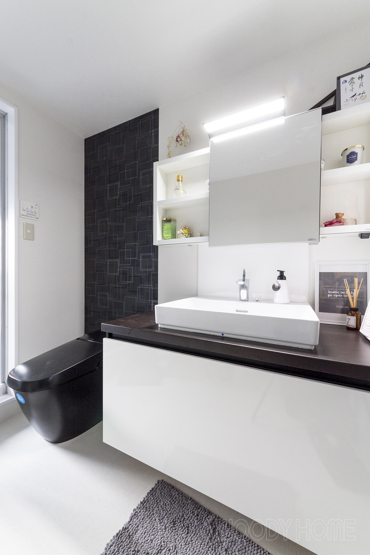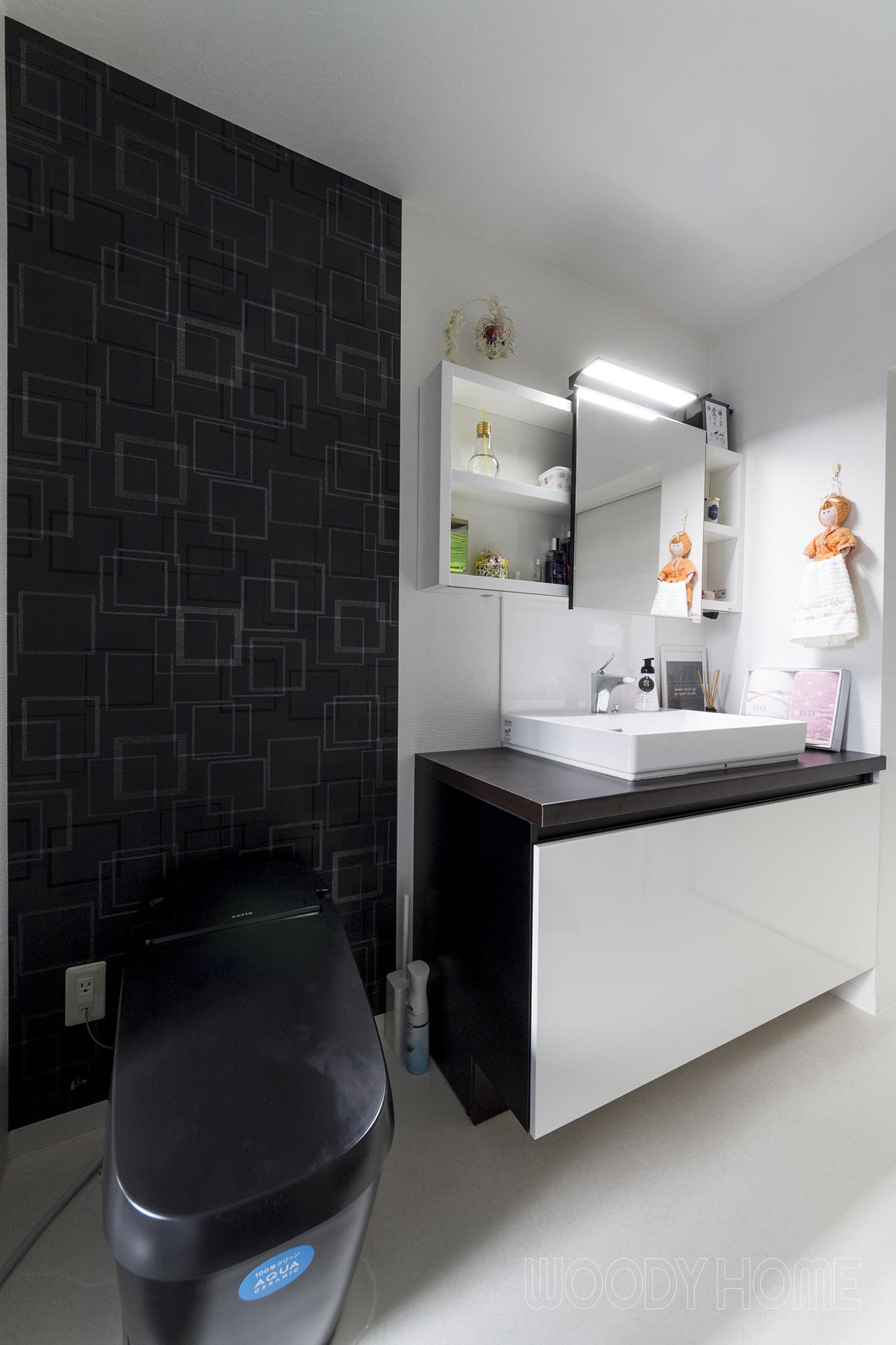 LIXIL「サティス」のブラックに入れ替えました。後ろの壁は黒系のクロスでアクセントを付け、ここもモノトーンでまとめています。