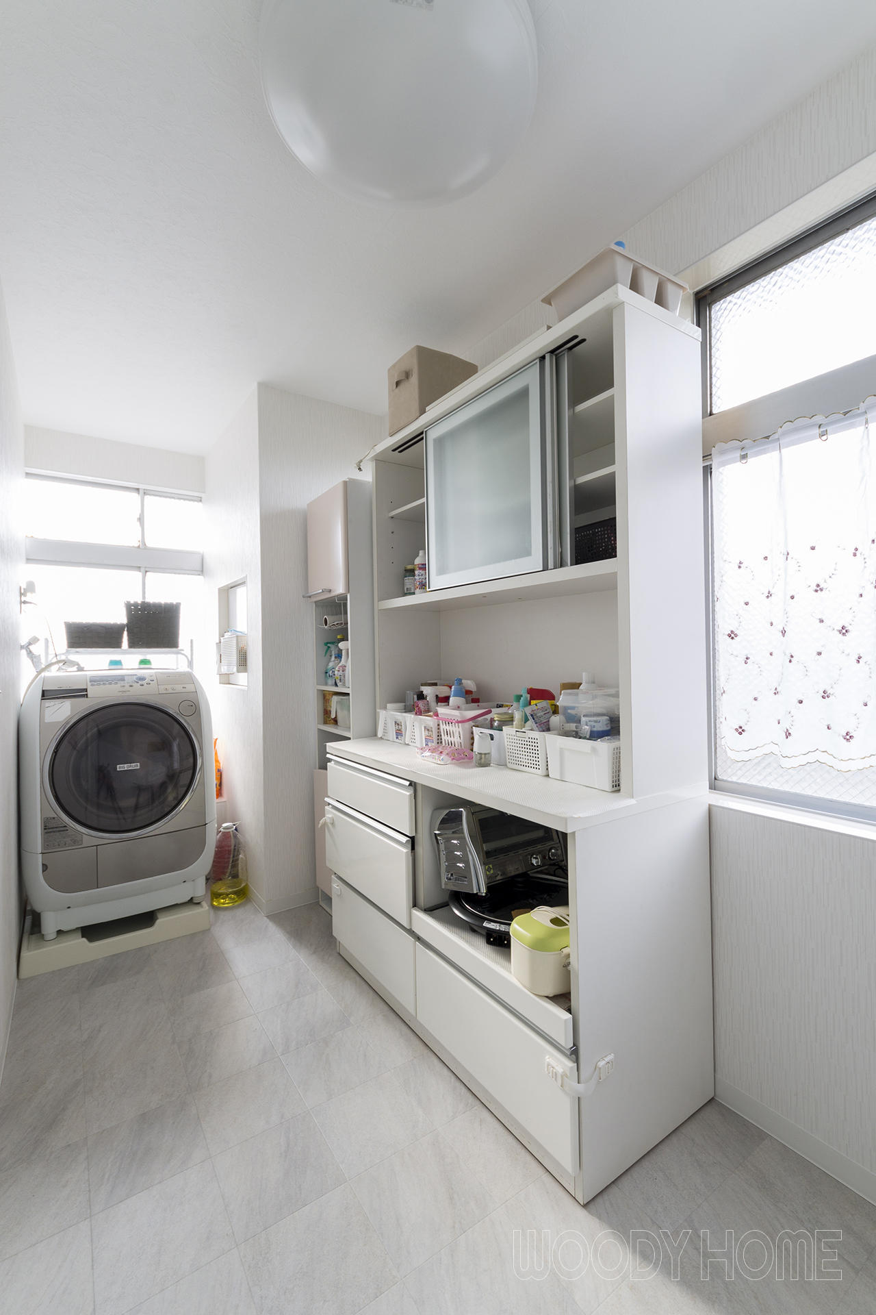 キッチン脇の以前浴室だったところは、収納スペースとして活かしています。