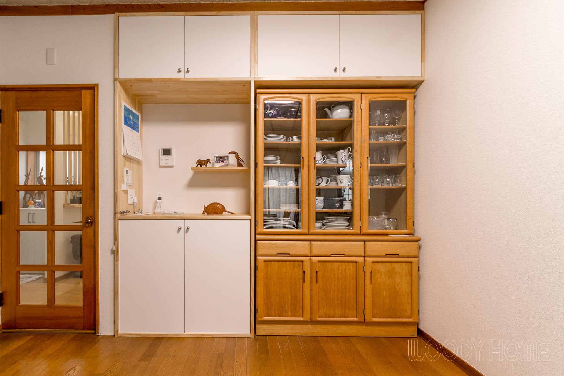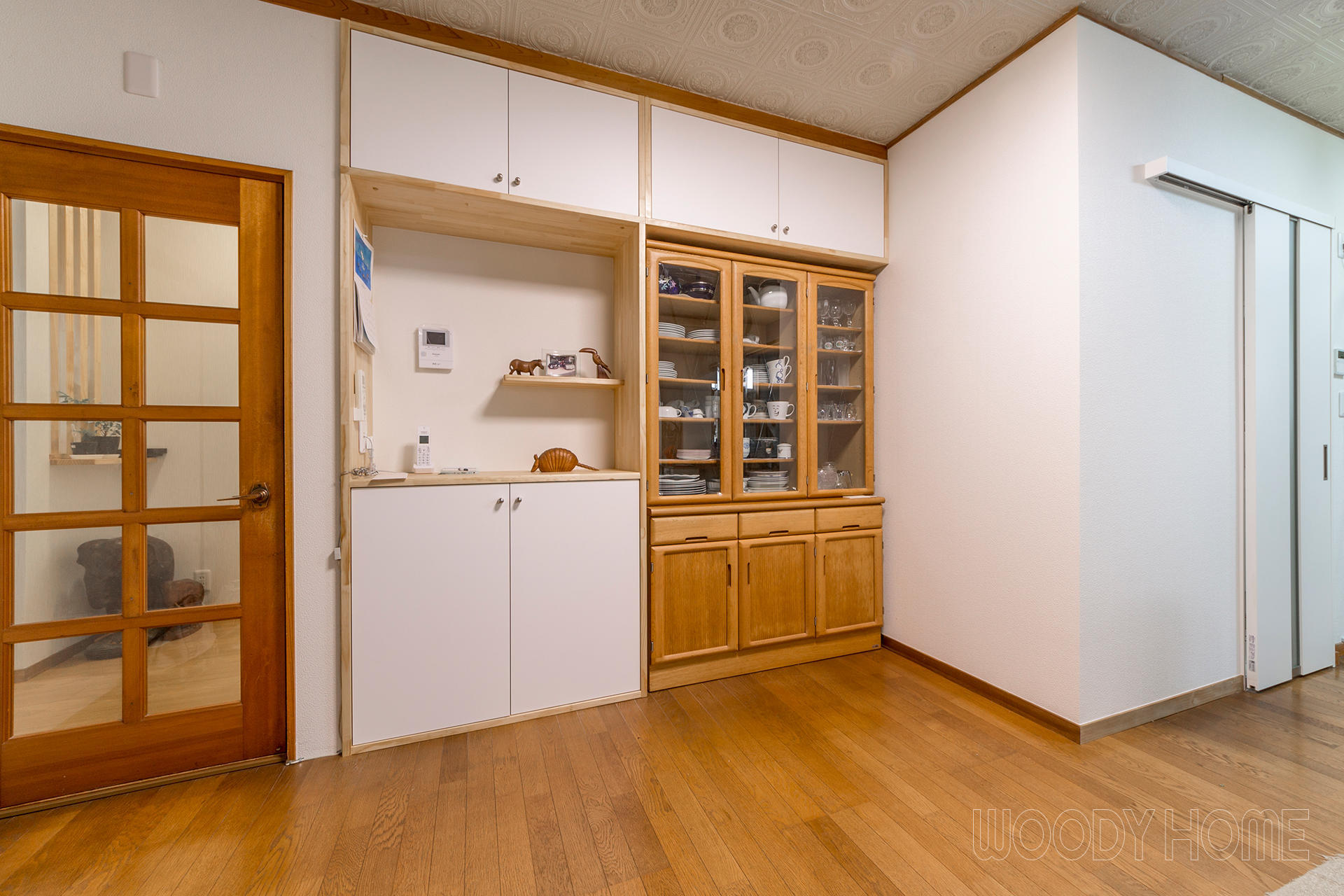 LDKの階段隣接部分は間取り変更にかかるので、併せて既存の食器に合せたパイン材の棚を造作。当社工事部の大工さんの手に依るものです。