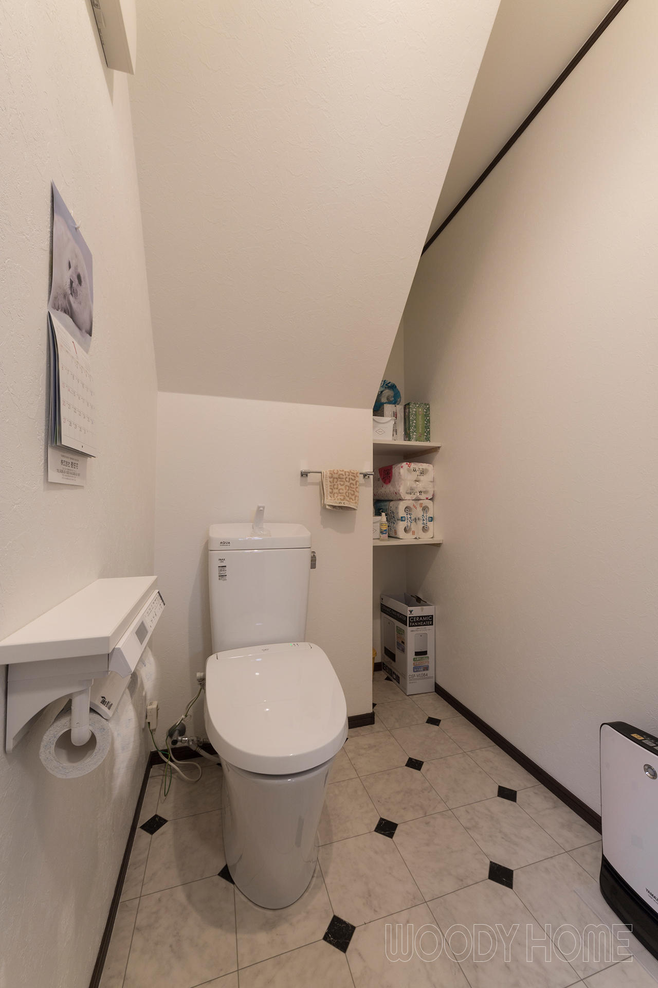元階段下の収納が広々としたトイレになりました。便器はLIXILの「アメージュZ」。サイドにはサニタリー用品を仕舞える収納庫も設けました。