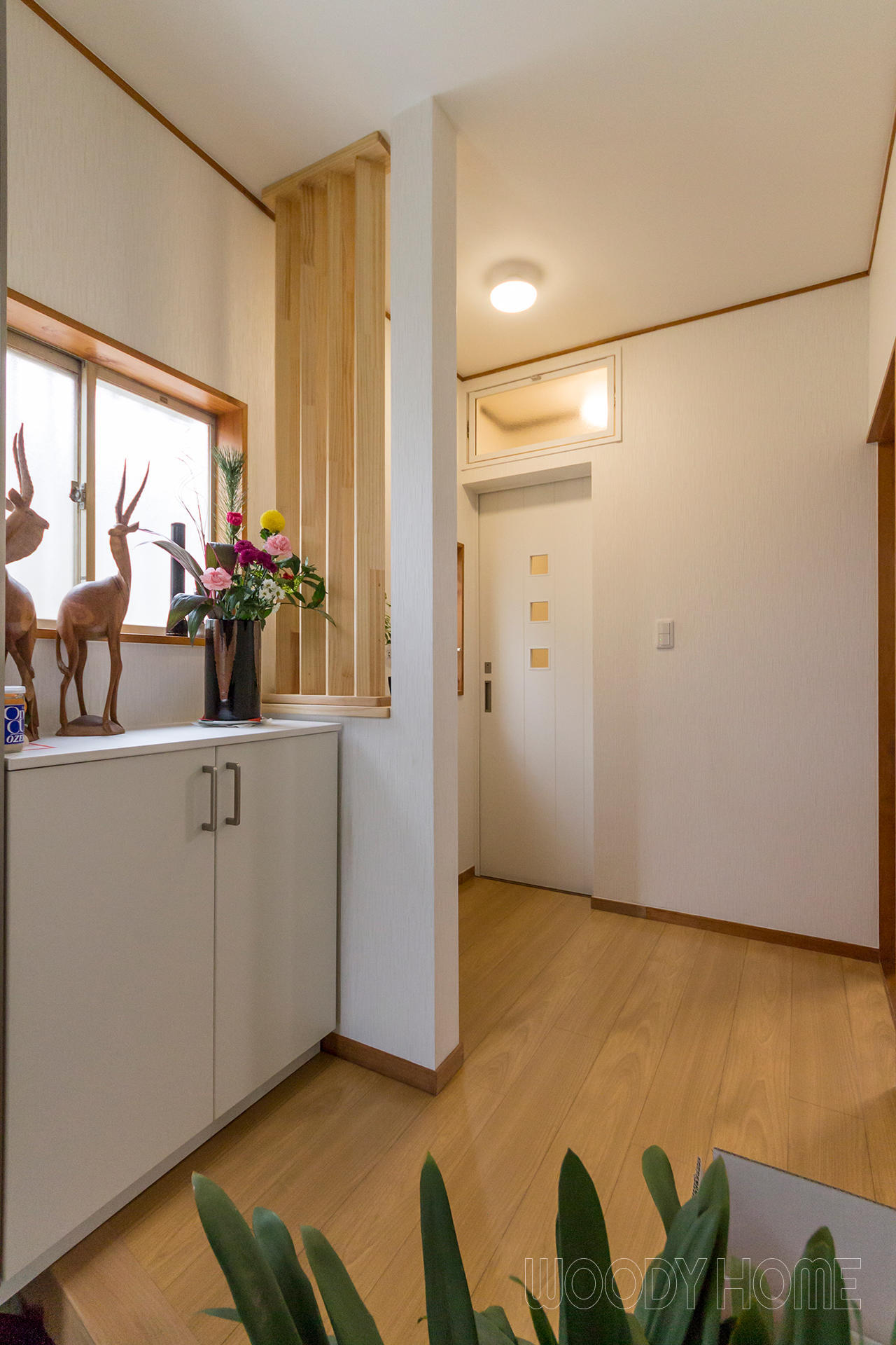 トイレを奥へ移動したので広い玄関アプローチとなりました。既存の柱を利用し、トイレ入り口の目隠しとして木製スリットの格子を設けました。