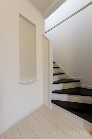 玄関ホールの扉向かいには小さなニッチを造作。どんな小物を飾るのか楽しみになりますね。階段は塗装で踏み板と蹴込みを塗り分けモノトーン調にしました。