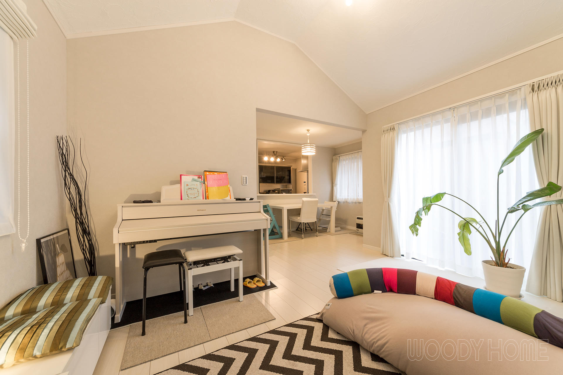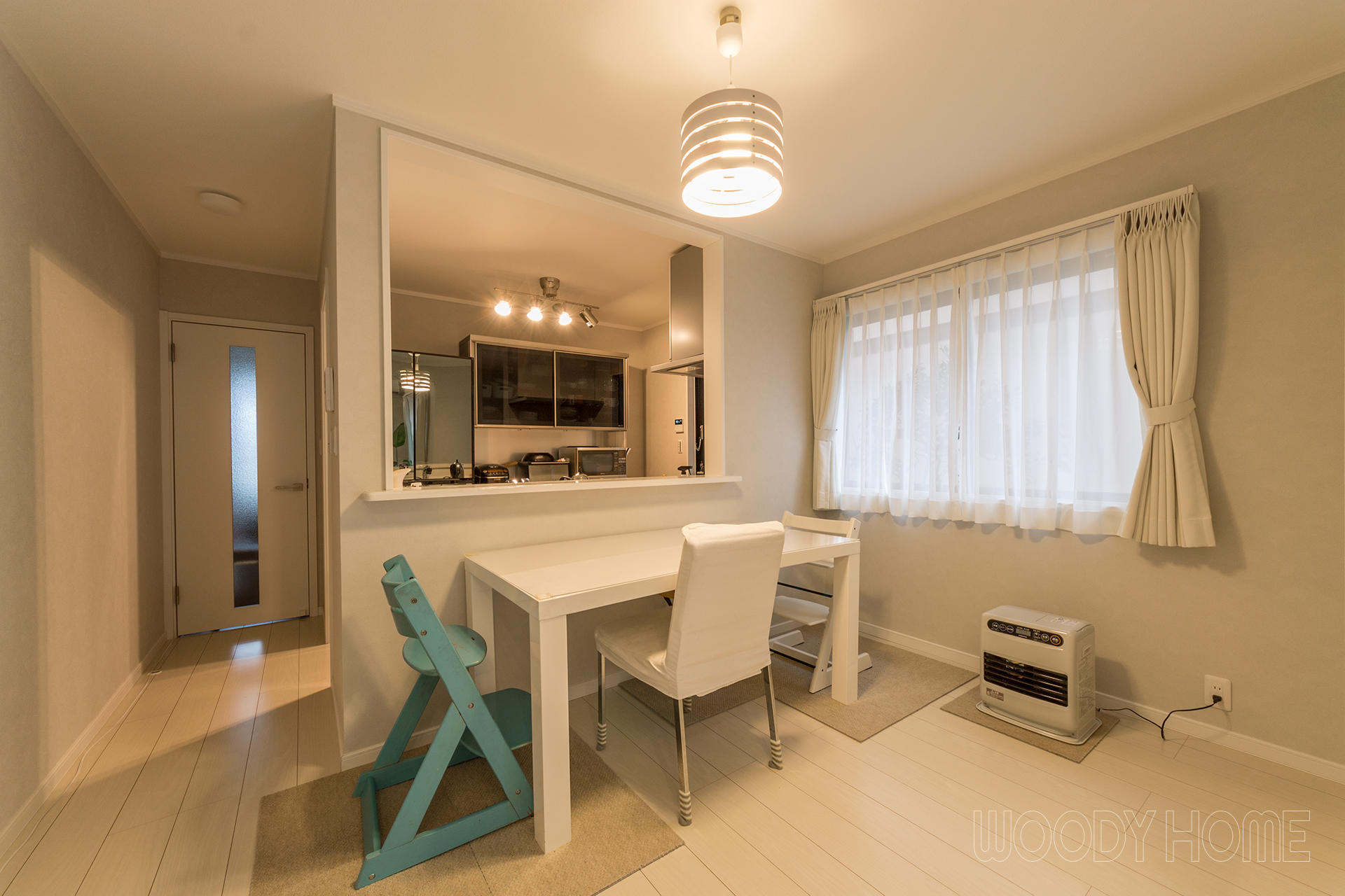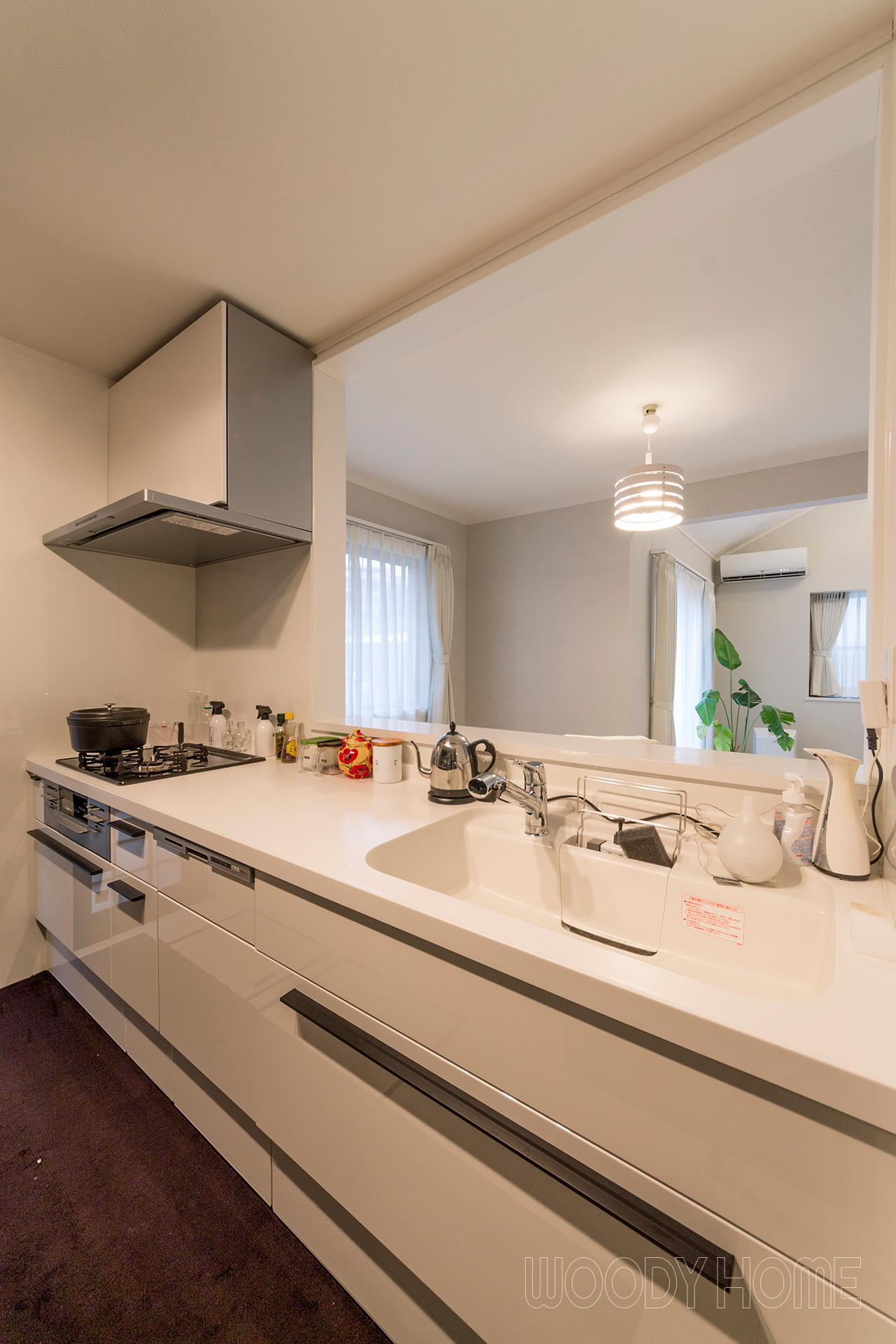 2×4住宅で耐力壁を抜けない制限がある中、キッチンとの開口を大きくしたことで、ダイニングテーブルに座るご主人やお子様と炊事をしながらコミュニケーションが取れるようになりました。