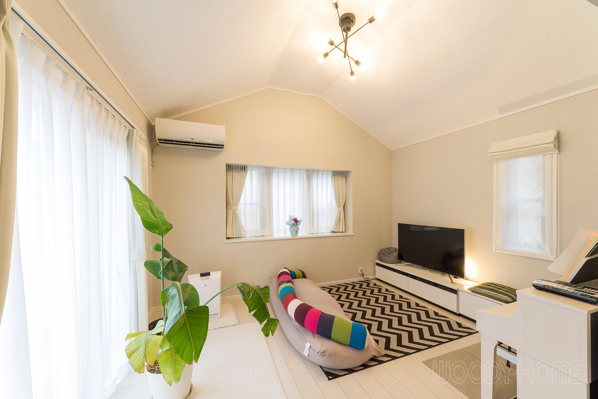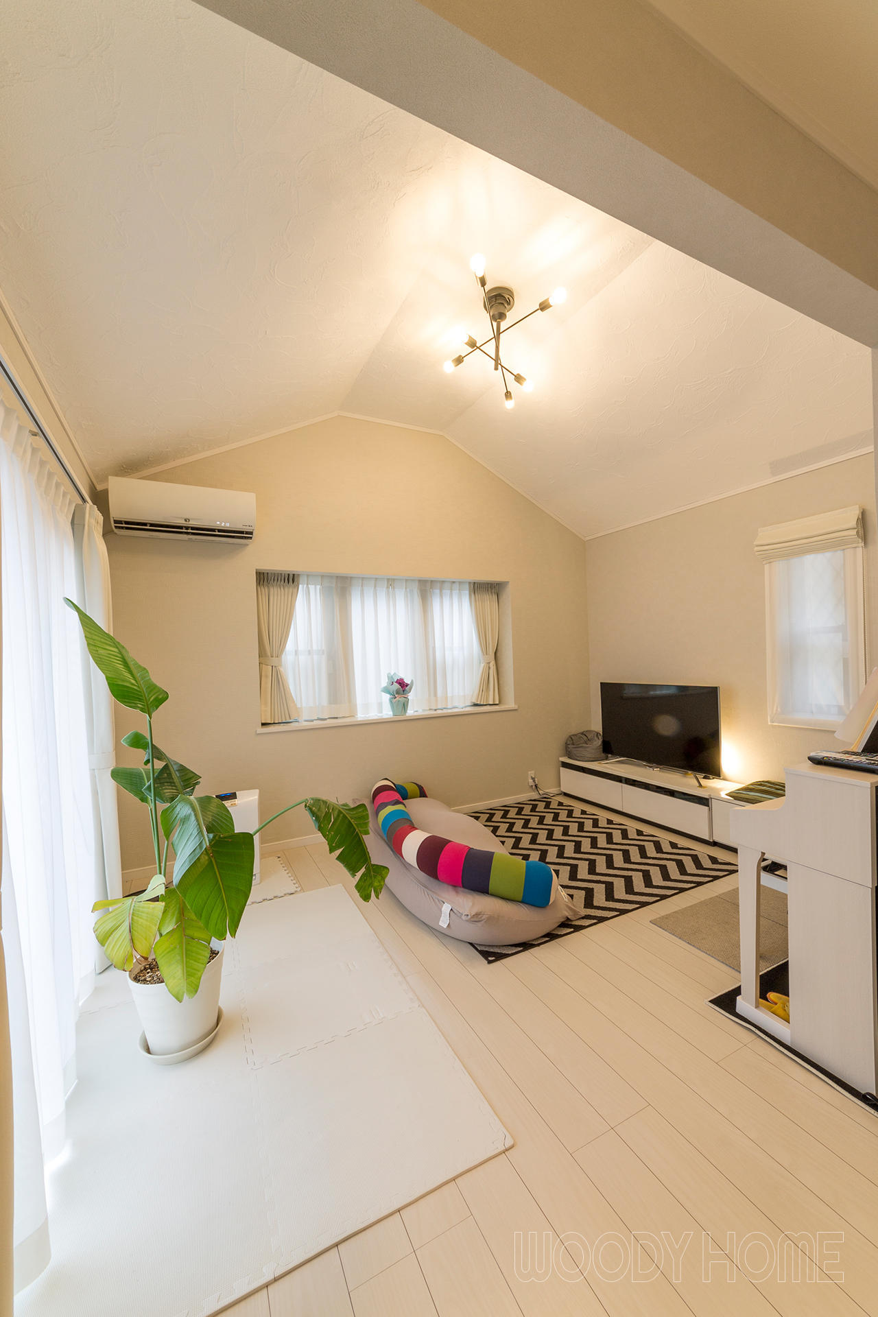 リビングの勾配天井はそのまま活かします。下がり壁や袖壁を撤去し開放感あふれるリビングになりました。天井には漆喰を塗ったのでコテ跡の陰影を愉しめ、調湿・消臭効果があるので心地良い空気空間でもあります。