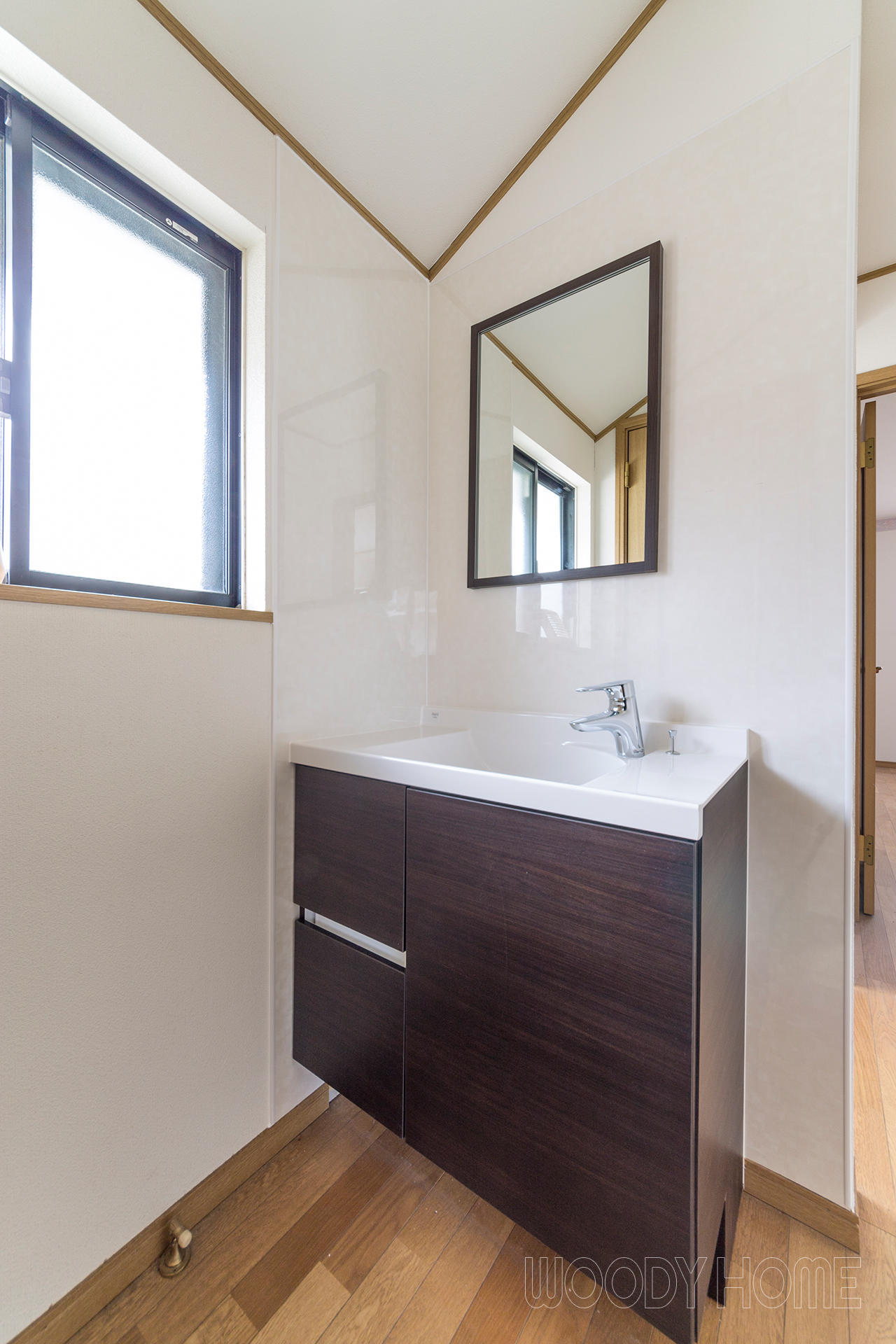 寝室や子供部屋のある2階の洗面化粧台はLIXILのオフトに入れ替え。 洗面台の面材と同じ調子の枠を使った鏡を壁に取り付けたシンプルな洗面化粧台です。