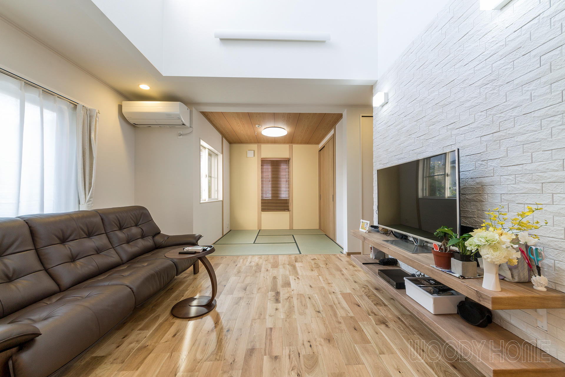 洋間4.5帖分は畳を敷いて壁も和風に仕上げたくつろぎの和空間。フローリングと畳の段差なくバリアフリーな収まりです。