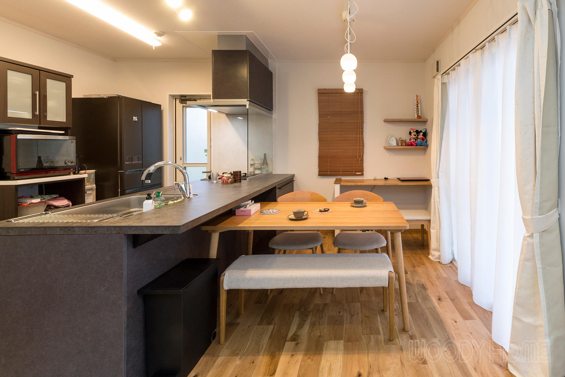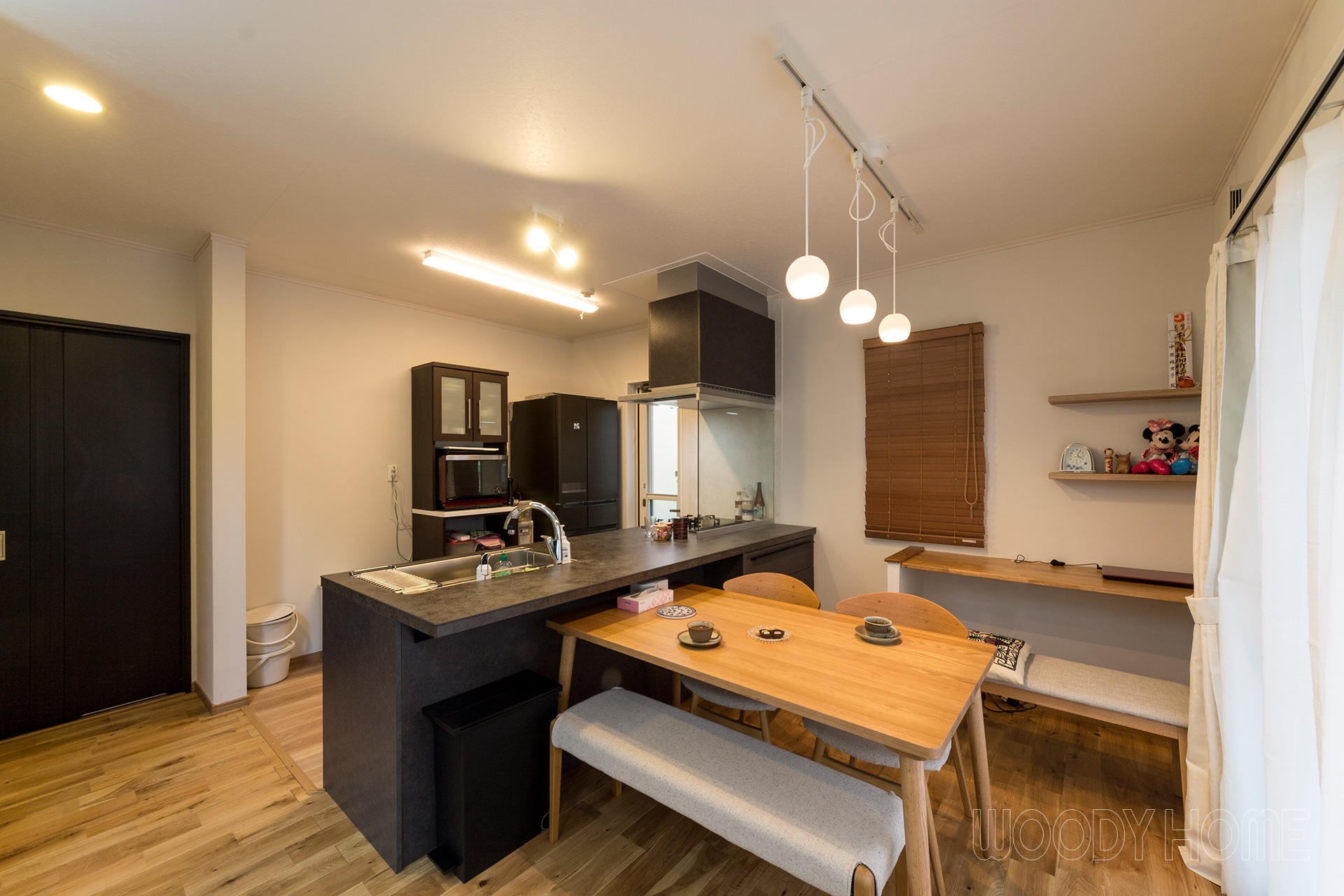 システムキッチンの広いカウンタートップを利用できるので、ダイニングの配膳・片付けもラクラクです。ダイニングの奥には造作でカウンターを設けたので、家事や炊事の合間にちょっとした作業をしたり、趣味を楽しんだりできます。