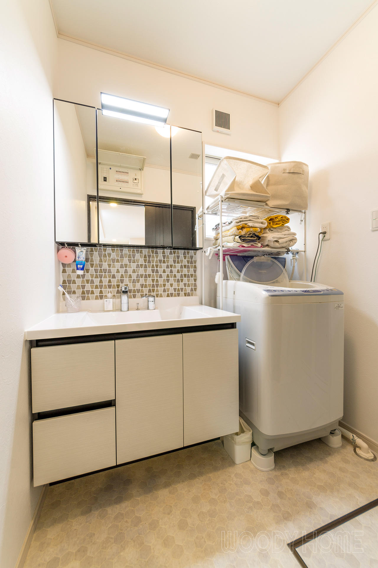 LIXILのショールームをご覧になってお決めいただいた洗面化粧台はLIXILのルミシス。収納にもなっている三面鏡と下台の間には、モザイクタイルを貼ってここもお洒落感を演出。このモザイクタイル部分は、カウンターと鏡の間を開けて鏡への水跳ねを減らし、掃除の手間が減る様に配慮もしたものです。