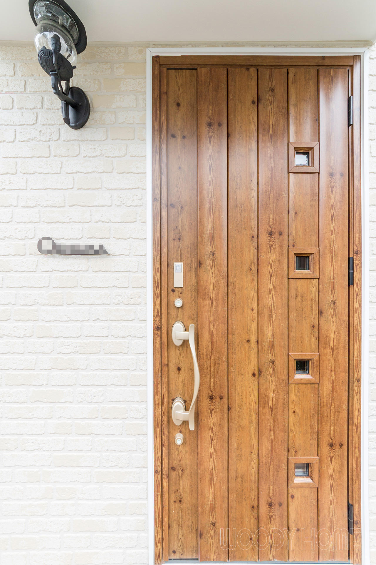 木目調のお洒落な玄関扉。玄関扉は「ジェスタ」。レンガ調の外壁とアイアンの表札は南欧風を意識したデザインです。